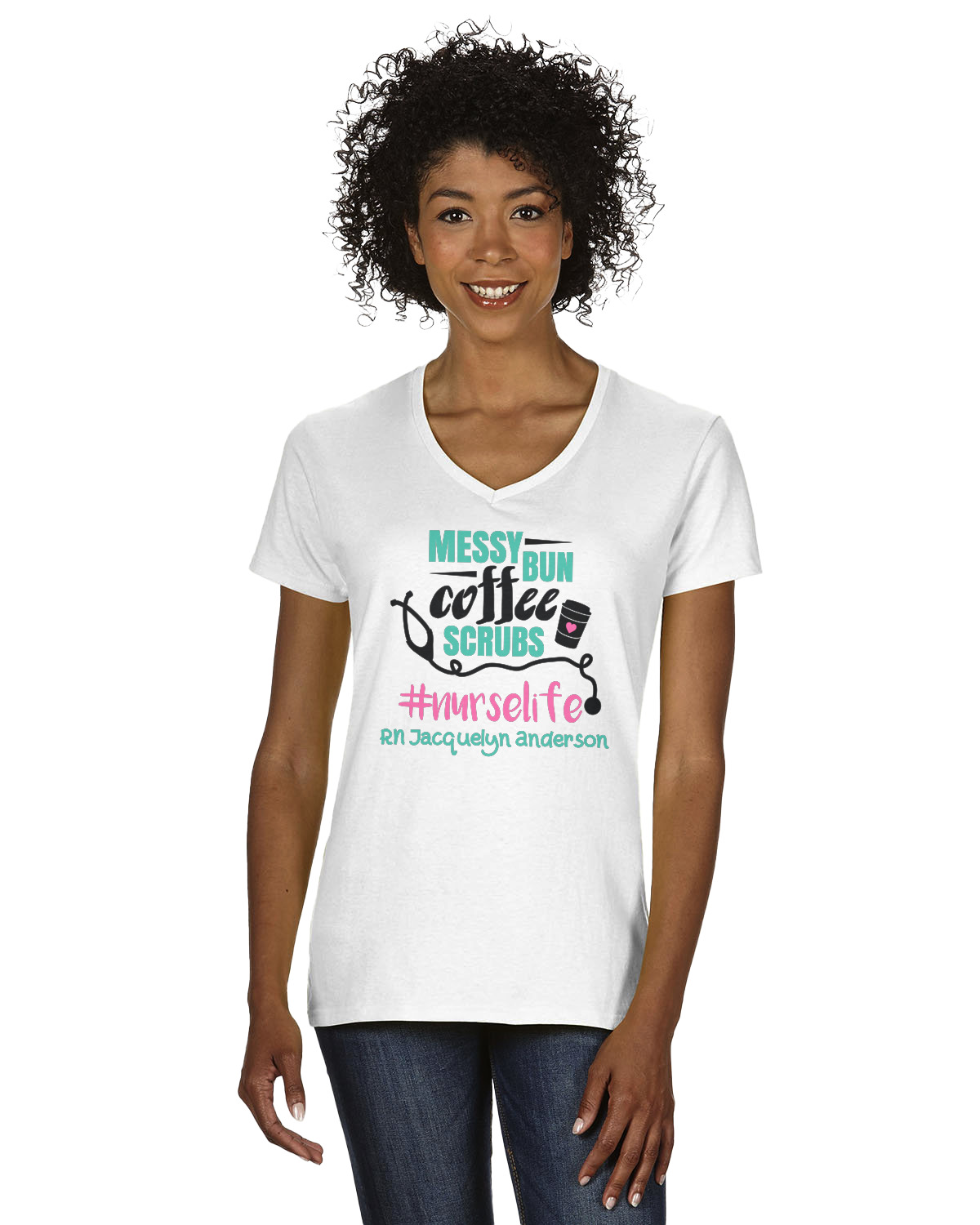 This design features a quote saying "messy bun, coffee, scrubs, #nurselife." The background has two different subtle patterns. One has subtle dots, while the other has fun illustrations of different medical tools and symbols. The two backgrounds are a soft pink. The quote has several different colors including pink, black, and teal.