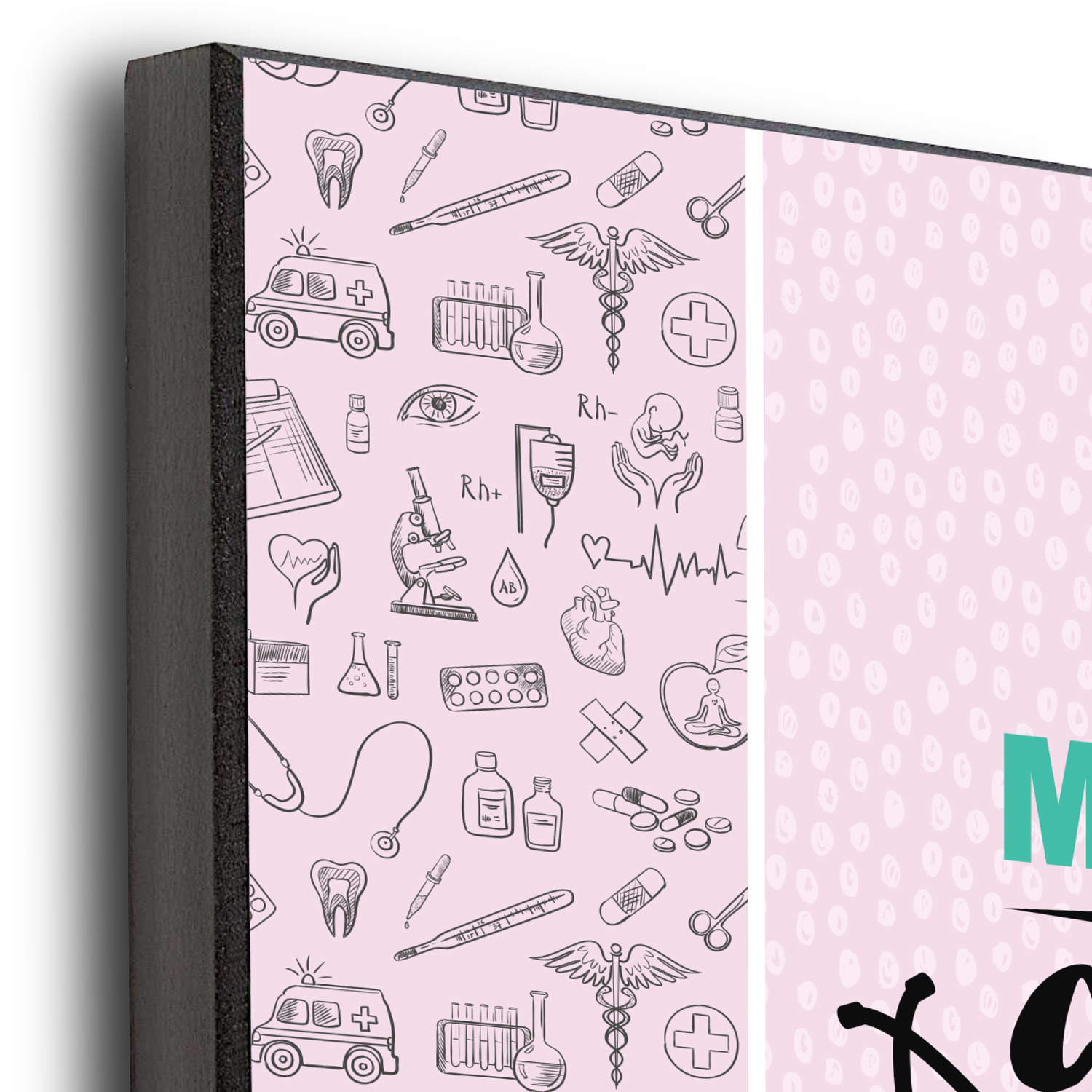 This design features a quote saying "messy bun, coffee, scrubs, #nurselife." The background has two different subtle patterns. One has subtle dots, while the other has fun illustrations of different medical tools and symbols. The two backgrounds are a soft pink. The quote has several different colors including pink, black, and teal.