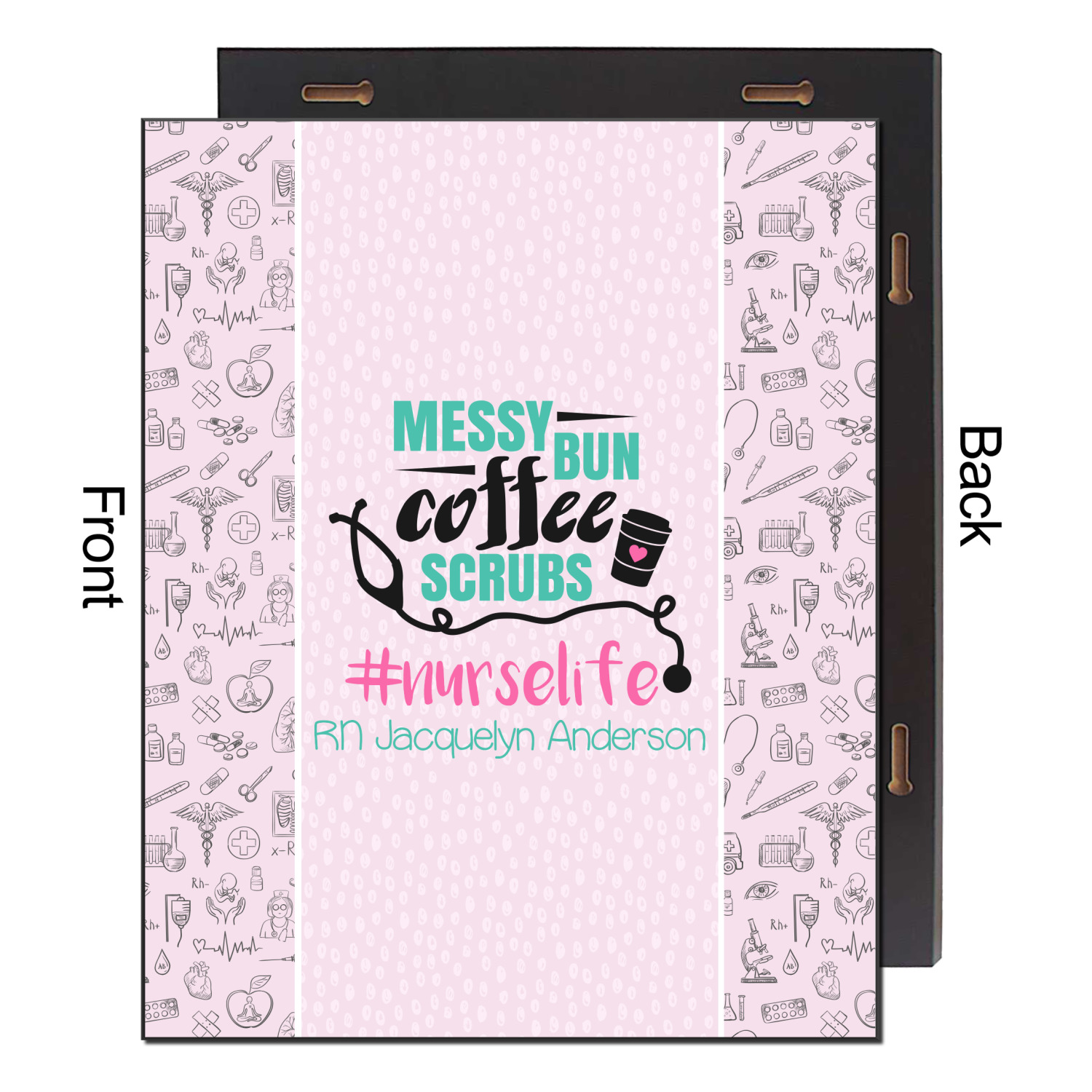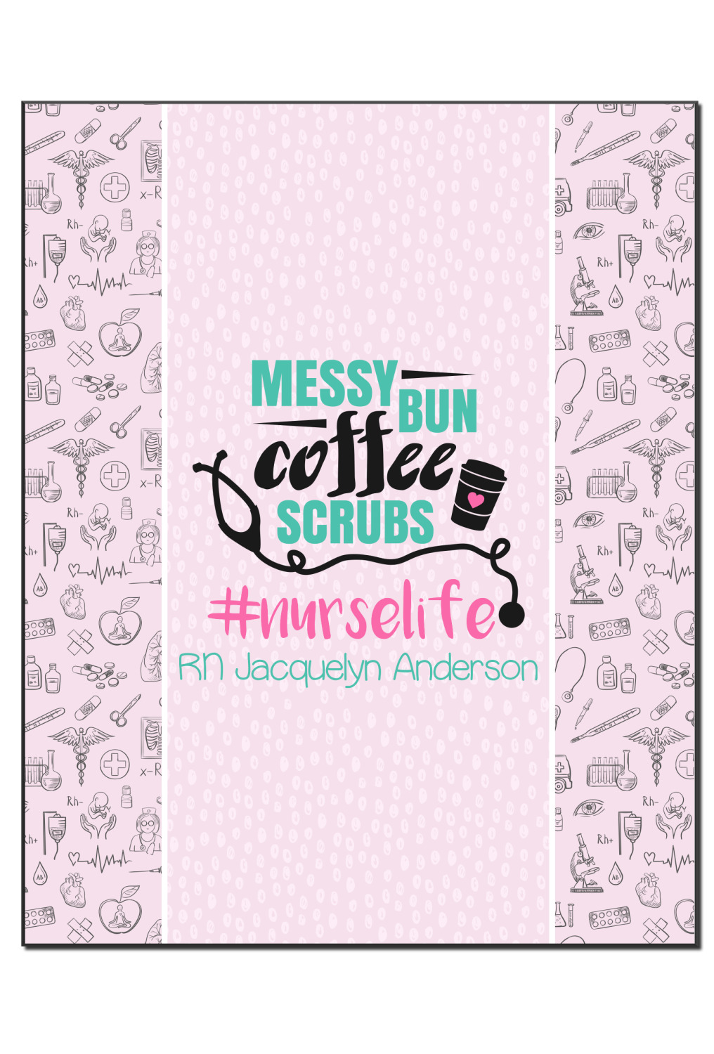 This design features a quote saying "messy bun, coffee, scrubs, #nurselife." The background has two different subtle patterns. One has subtle dots, while the other has fun illustrations of different medical tools and symbols. The two backgrounds are a soft pink. The quote has several different colors including pink, black, and teal.
