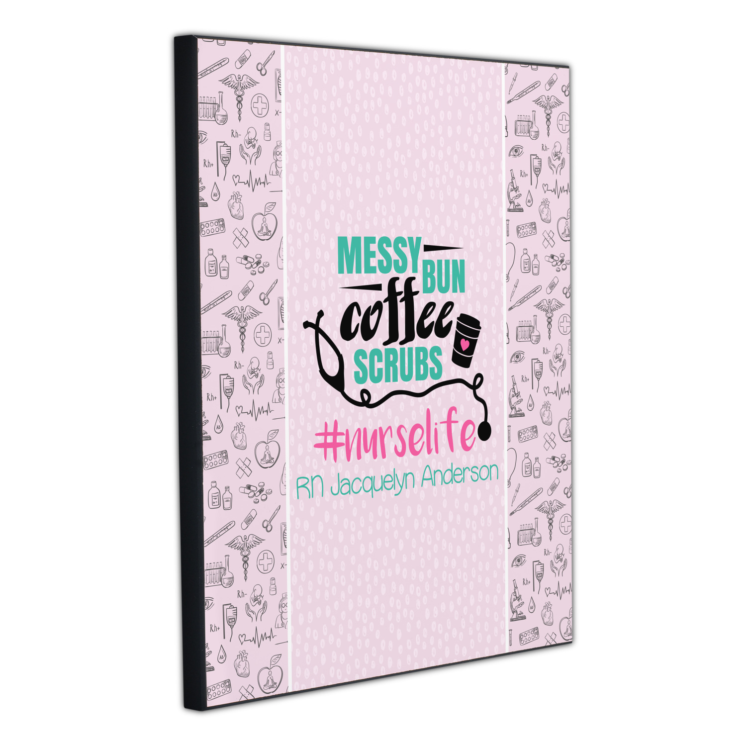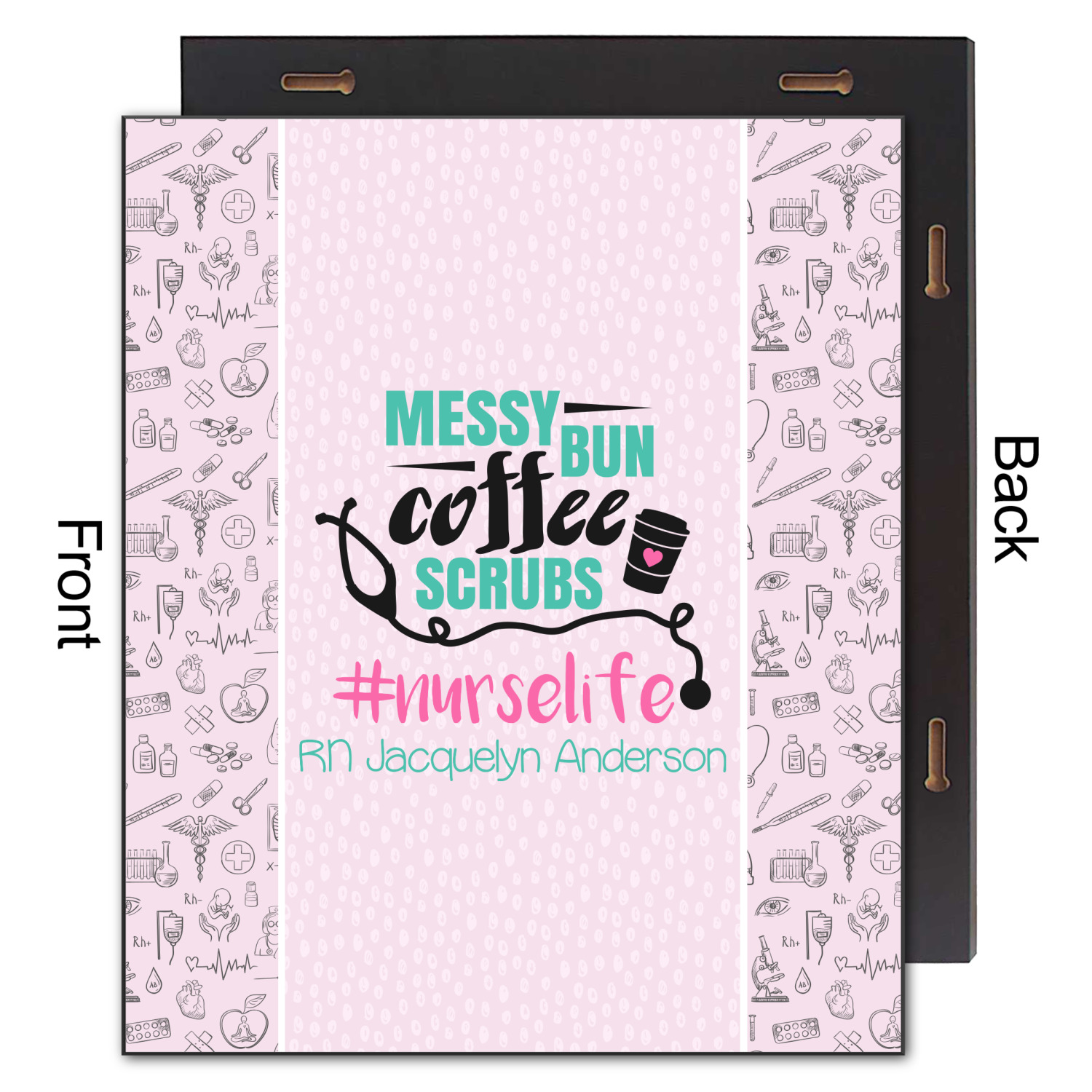 This design features a quote saying "messy bun, coffee, scrubs, #nurselife." The background has two different subtle patterns. One has subtle dots, while the other has fun illustrations of different medical tools and symbols. The two backgrounds are a soft pink. The quote has several different colors including pink, black, and teal.