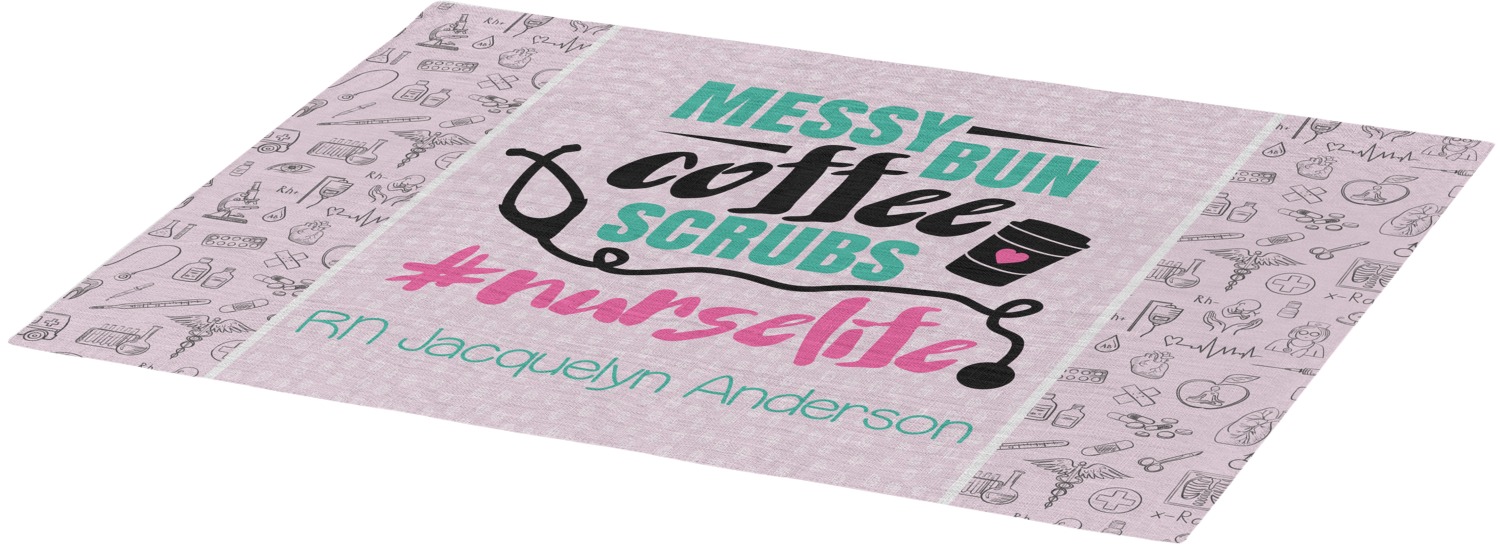 Each of our table mats are a poly twill material with woven burlap detailing. This creates a soft, quality placemat for us to fully print your personalized design across. The woven twill also adds a wrinkle-free surface to set your table! Each customizable placemat is a rectangle shape measuring at approximately 13 x 18 and printed here in the USA.