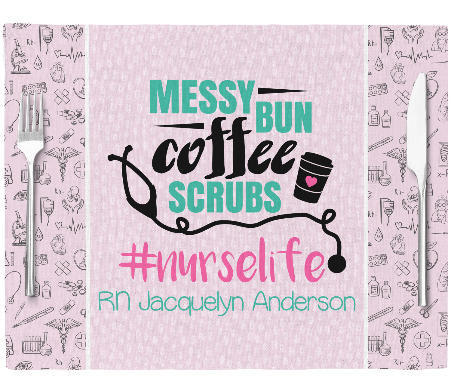 This design features a quote saying "messy bun, coffee, scrubs, #nurselife." The background has two different subtle patterns. One has subtle dots, while the other has fun illustrations of different medical tools and symbols. The two backgrounds are a soft pink. The quote has several different colors including pink, black, and teal.