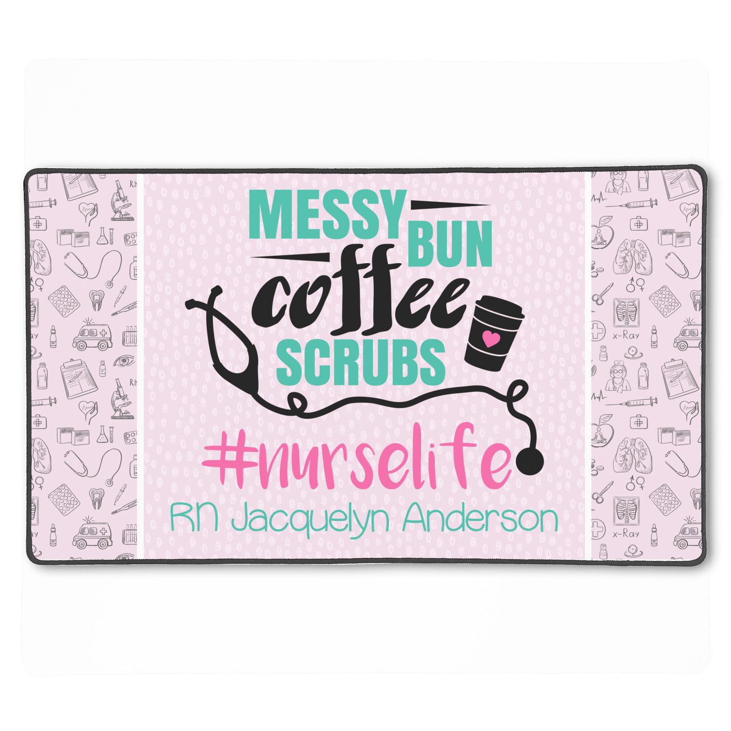 This design features a quote saying "messy bun, coffee, scrubs, #nurselife." The background has two different subtle patterns. One has subtle dots, while the other has fun illustrations of different medical tools and symbols. The two backgrounds are a soft pink. The quote has several different colors including pink, black, and teal.