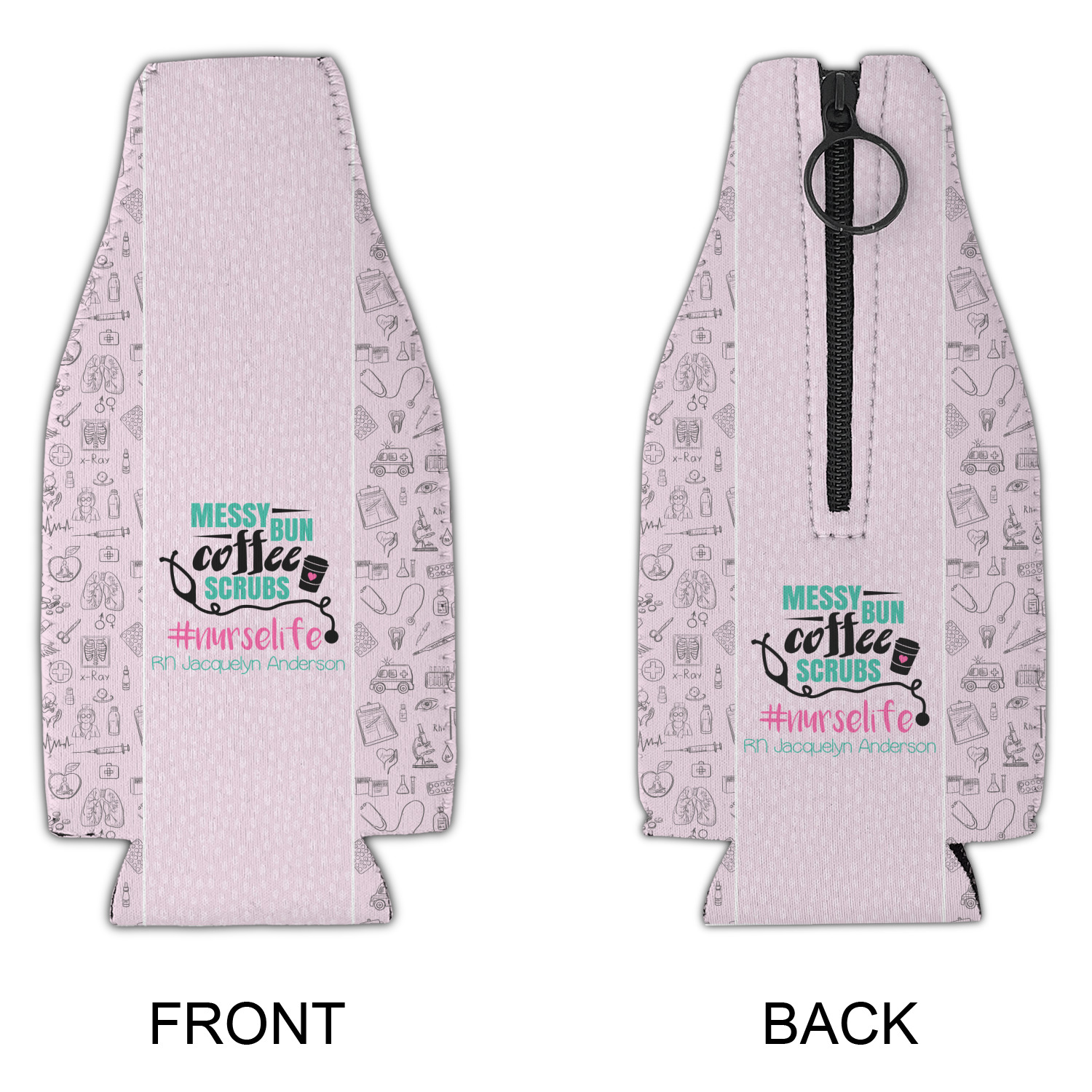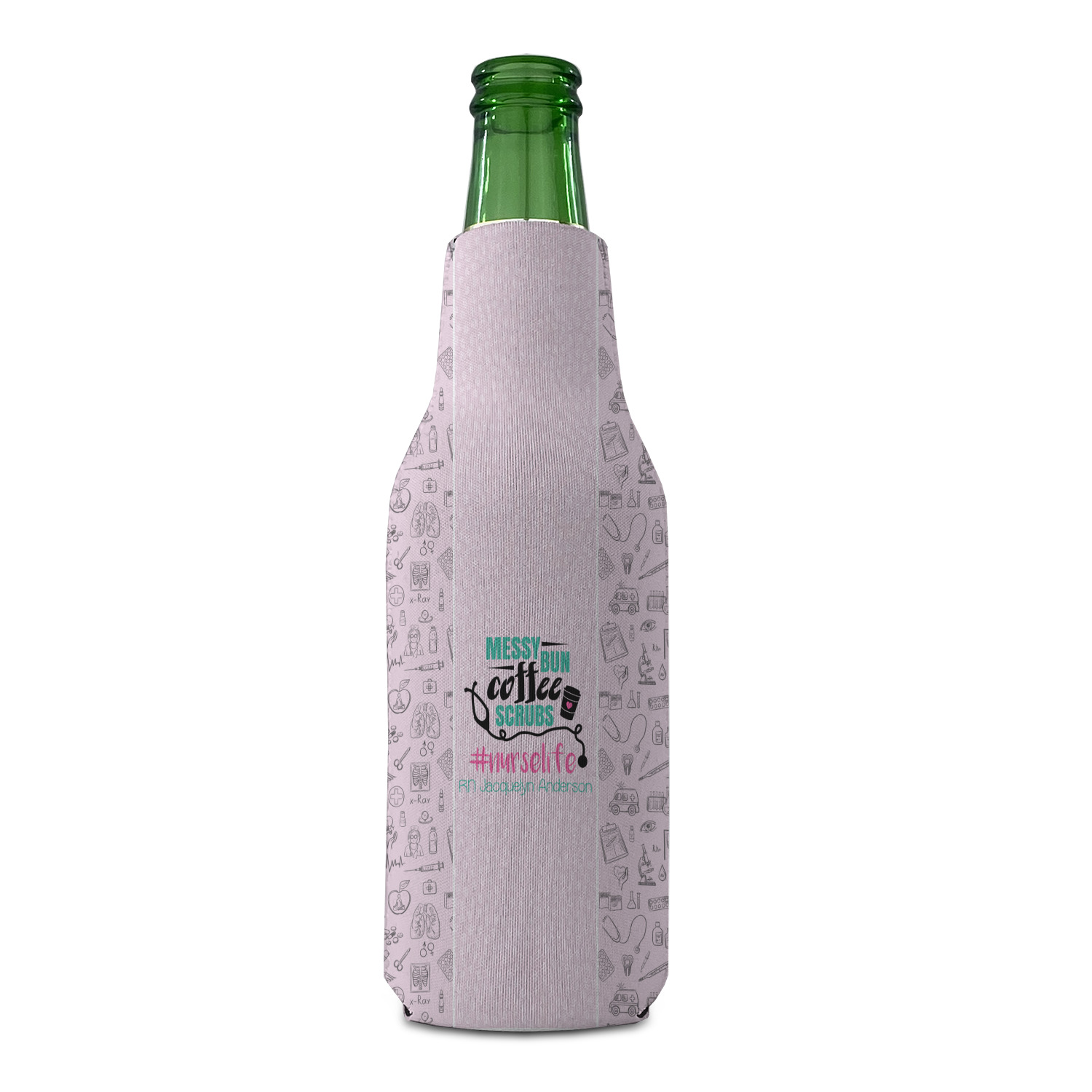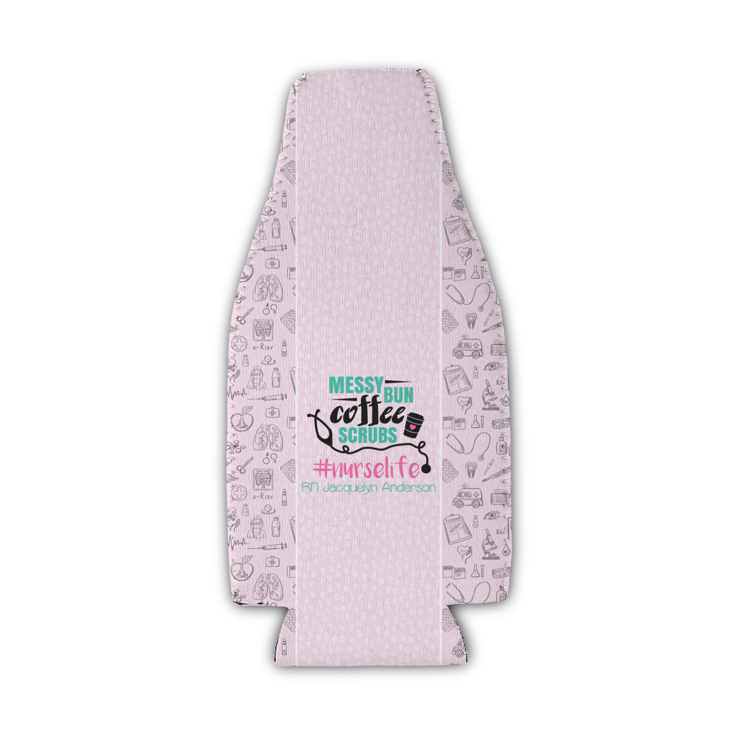 This design features a quote saying "messy bun, coffee, scrubs, #nurselife." The background has two different subtle patterns. One has subtle dots, while the other has fun illustrations of different medical tools and symbols. The two backgrounds are a soft pink. The quote has several different colors including pink, black, and teal.