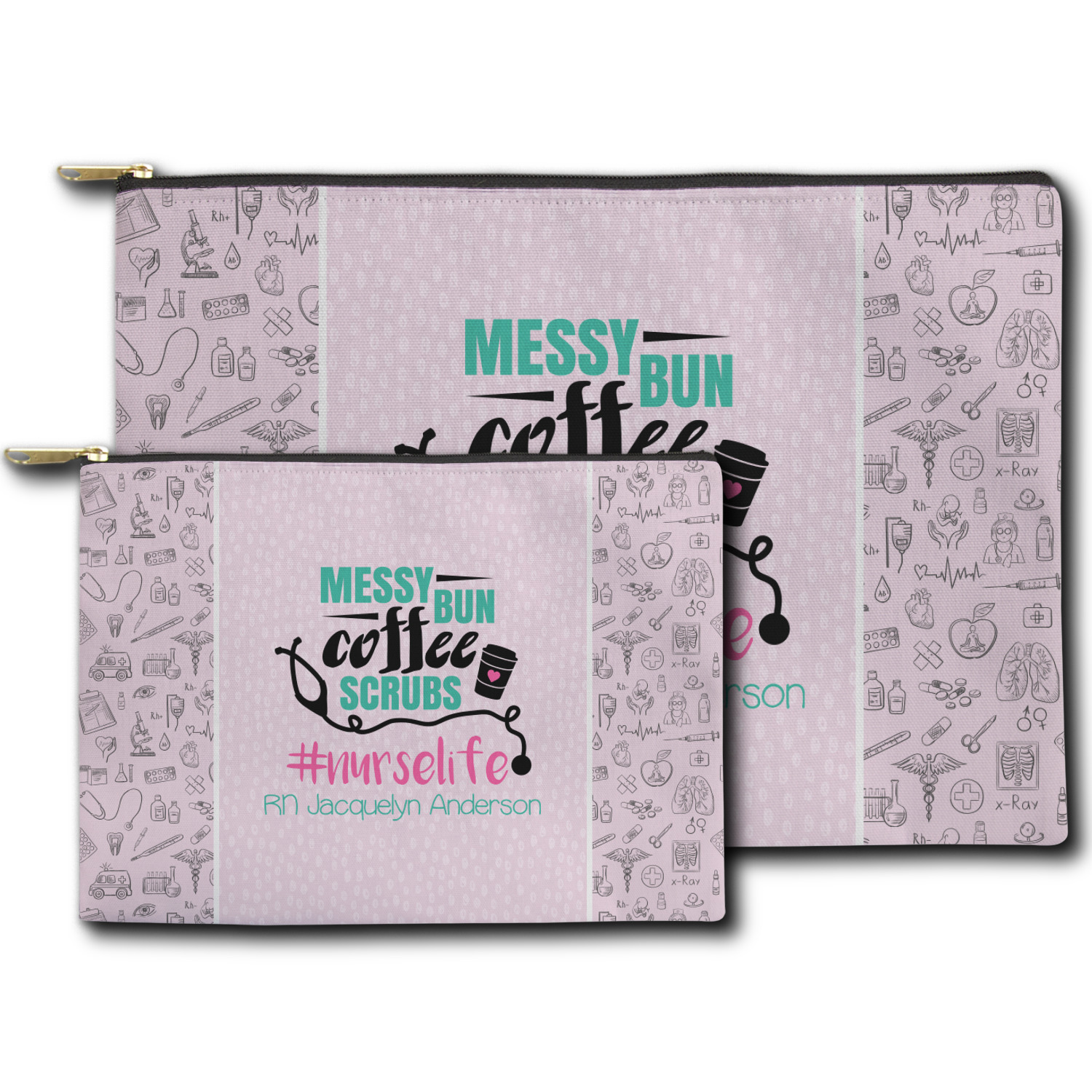 This design features a quote saying "messy bun, coffee, scrubs, #nurselife." The background has two different subtle patterns. One has subtle dots, while the other has fun illustrations of different medical tools and symbols. The two backgrounds are a soft pink. The quote has several different colors including pink, black, and teal.