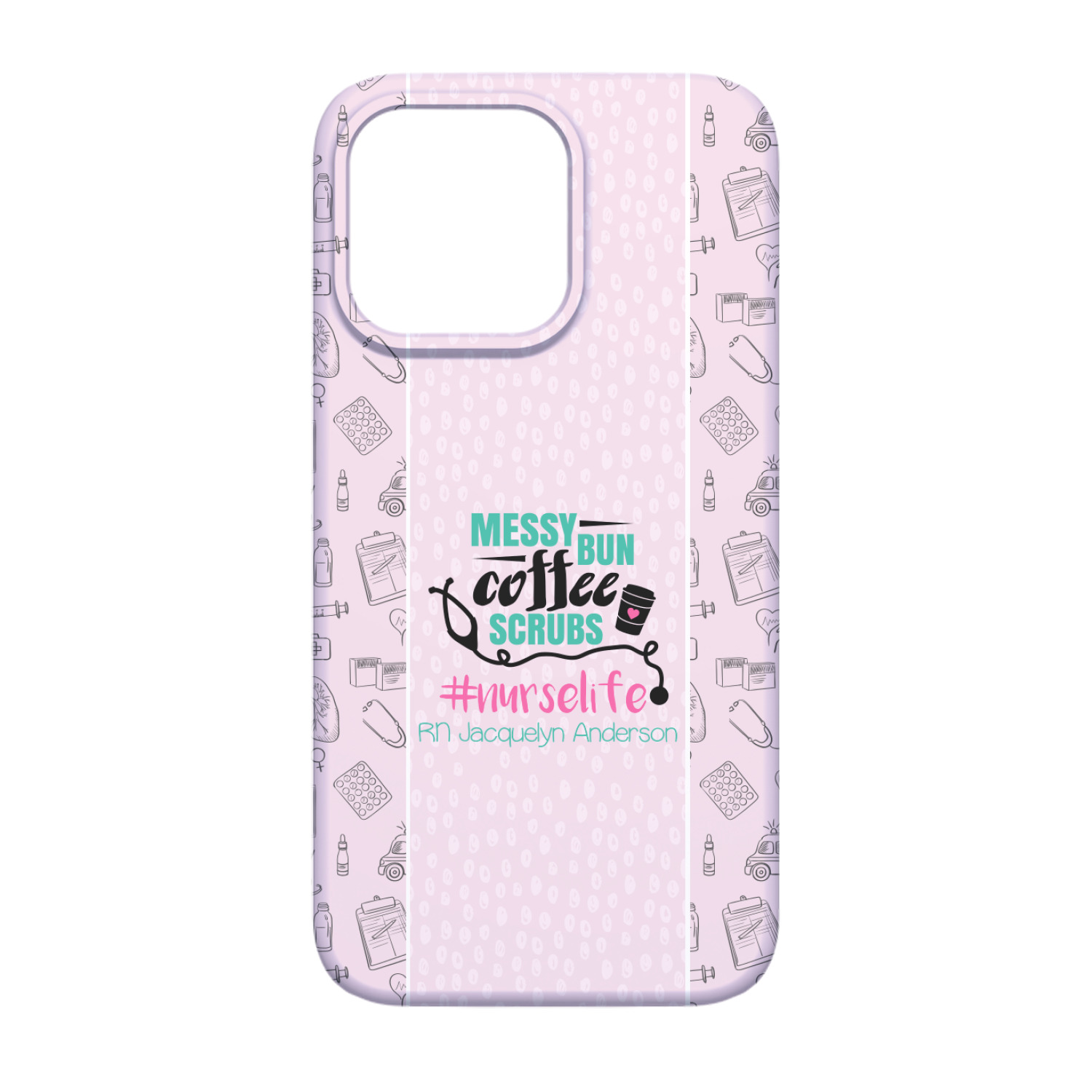 This design features a quote saying "messy bun, coffee, scrubs, #nurselife." The background has two different subtle patterns. One has subtle dots, while the other has fun illustrations of different medical tools and symbols. The two backgrounds are a soft pink. The quote has several different colors including pink, black, and teal.