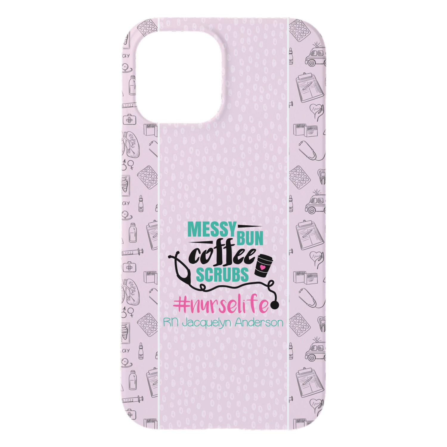 This design features a quote saying "messy bun, coffee, scrubs, #nurselife." The background has two different subtle patterns. One has subtle dots, while the other has fun illustrations of different medical tools and symbols. The two backgrounds are a soft pink. The quote has several different colors including pink, black, and teal.