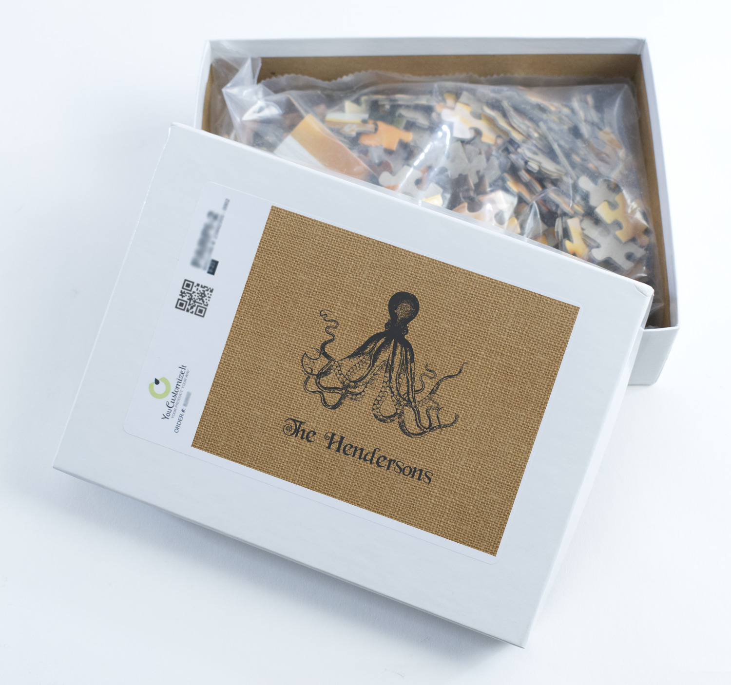 We print our puzzles on thick white chipboard in vibrant colors, then laminate the chipboard and die cut your puzzle. Your jigsaw puzzle is shipped to you in a box with the image of the puzzle on the box.