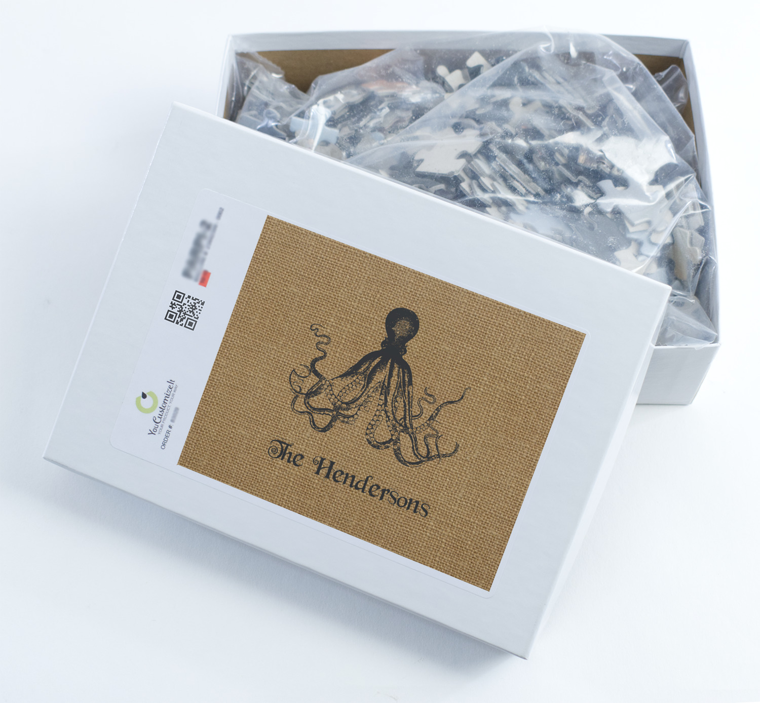 We print our puzzles on thick white chipboard in vibrant colors, then laminate the chipboard and die cut your puzzle. Your jigsaw puzzle is shipped to you in a box with the image of the puzzle on the box.