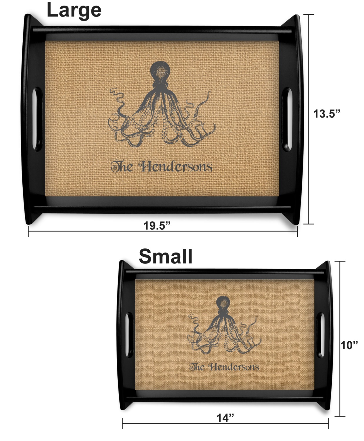 This serving tray with handles features square edges and two rounded sides, creating a very modern look. Each side is fabricated from a beautifully cut, natural wood. The bottom of the interior of the tray displays your customized design in bright, vibrant color. The tray is sold in both a black color and a natural wood look. Each variation of the wood serving tray has two sizes: Small, which is 14" x 10" x 2.25", and Large, which is 19.5" x 13.5" x 2.75".