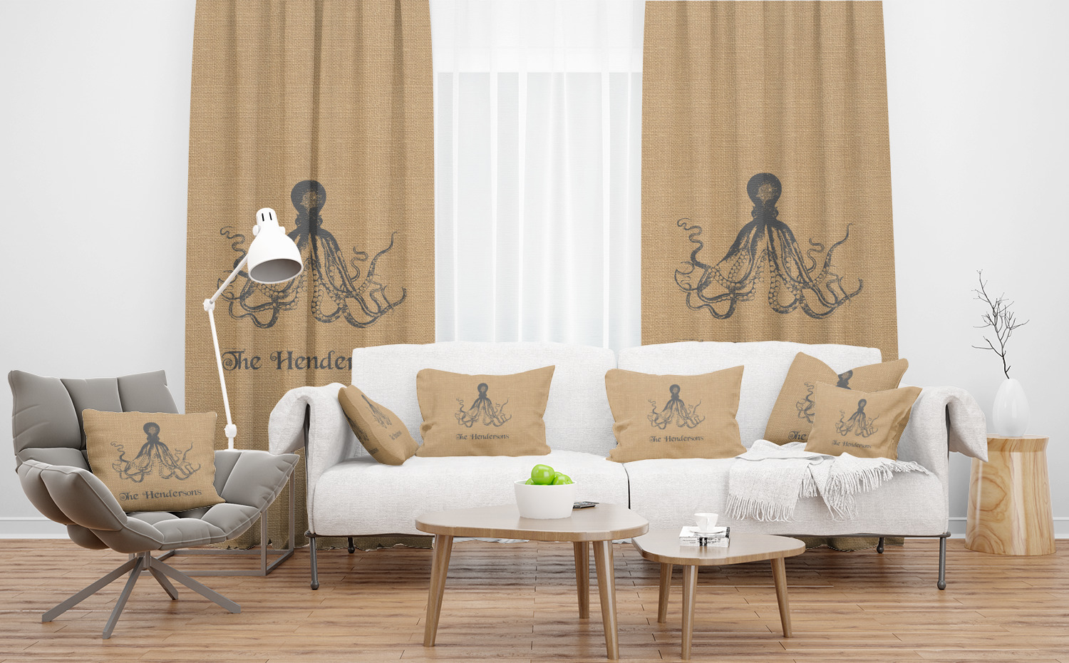 This design has a vintage octopus on burlap. It is a very chic and unusual design. We choose to use the traditional burlap color and the vintage octopus in a dark grey. Not only can you change the color of the burlap and the octopus, you can change the octopus as well. We have many different vintage designs that you can choose from such as sea horses, sea turtles, ships, anchors, compasses etc