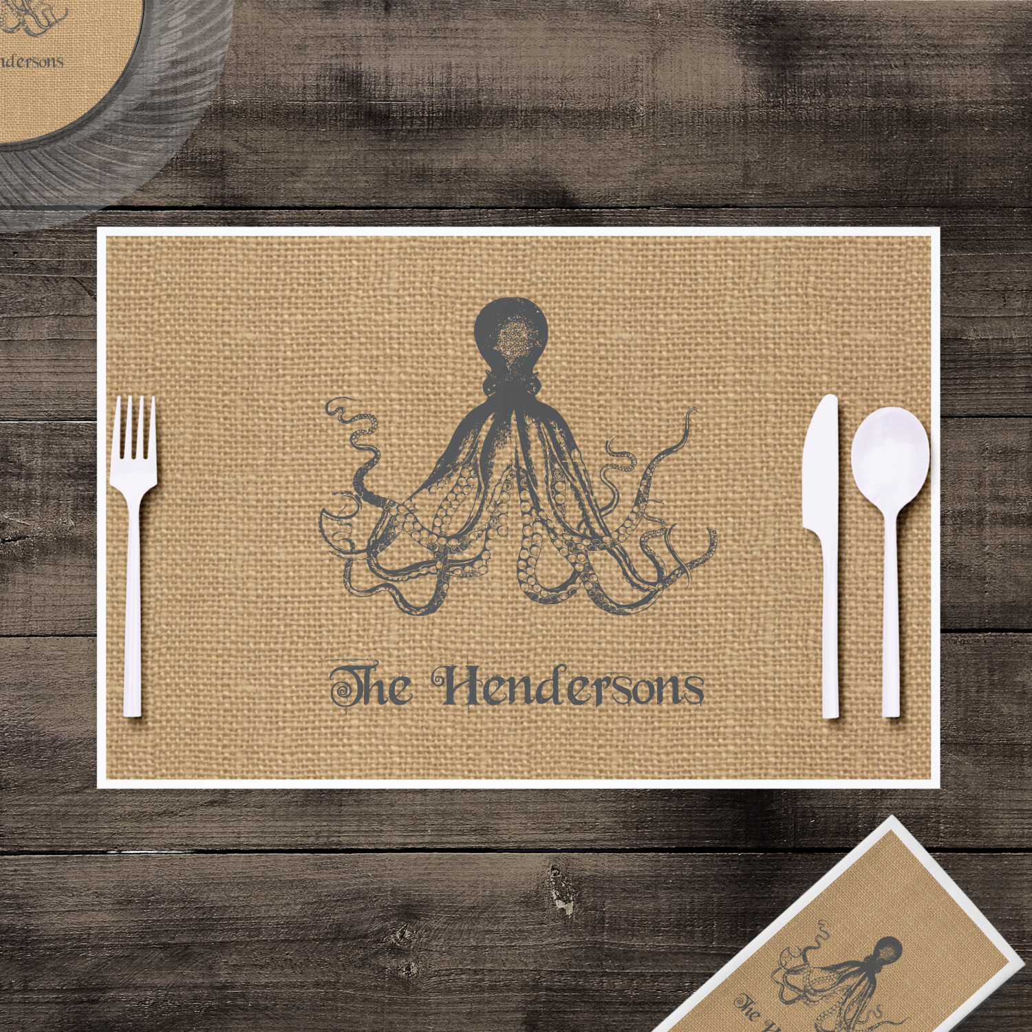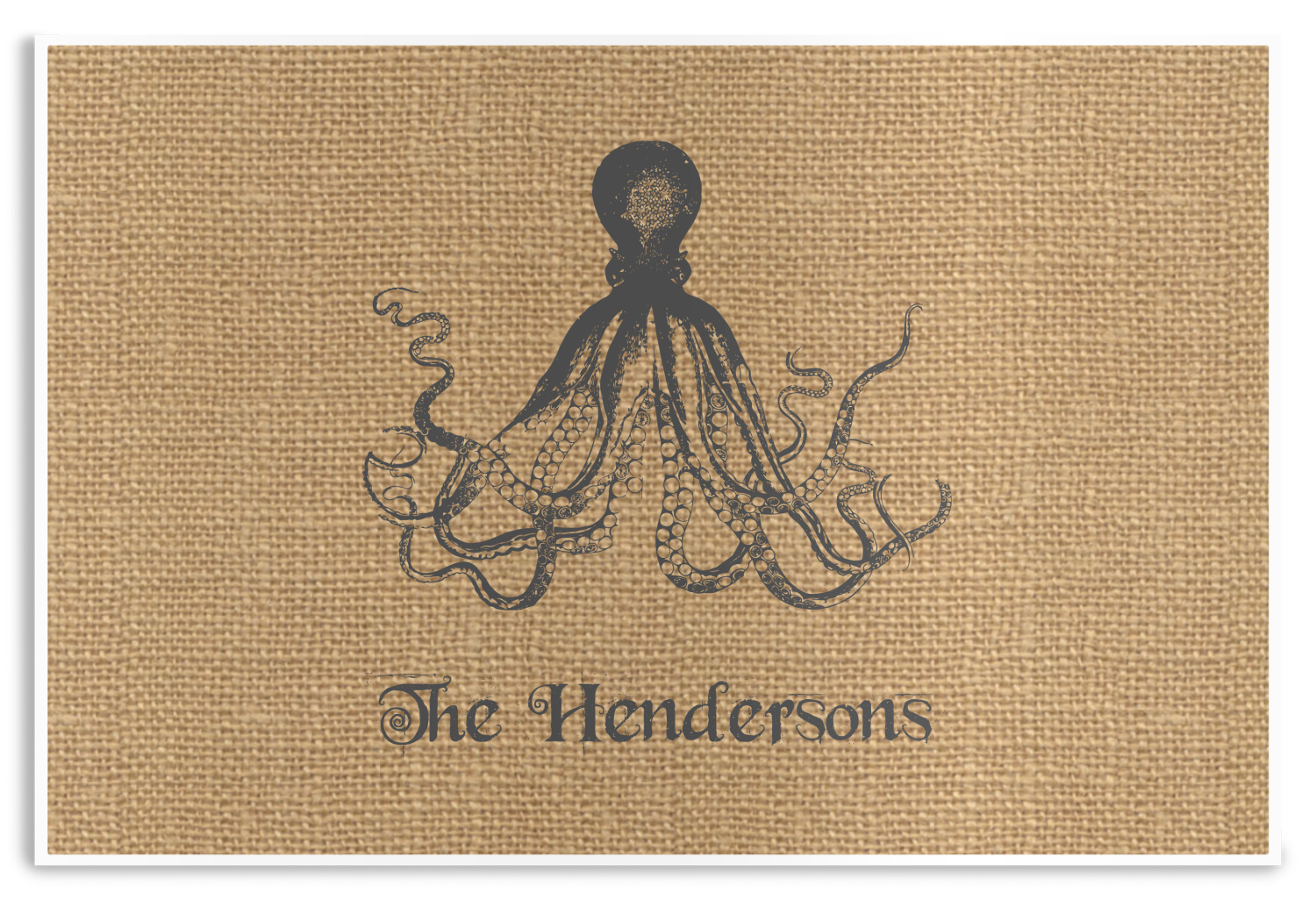 This design has a vintage octopus on burlap. It is a very chic and unusual design. We choose to use the traditional burlap color and the vintage octopus in a dark grey. Not only can you change the color of the burlap and the octopus, you can change the octopus as well. We have many different vintage designs that you can choose from such as sea horses, sea turtles, ships, anchors, compasses etc