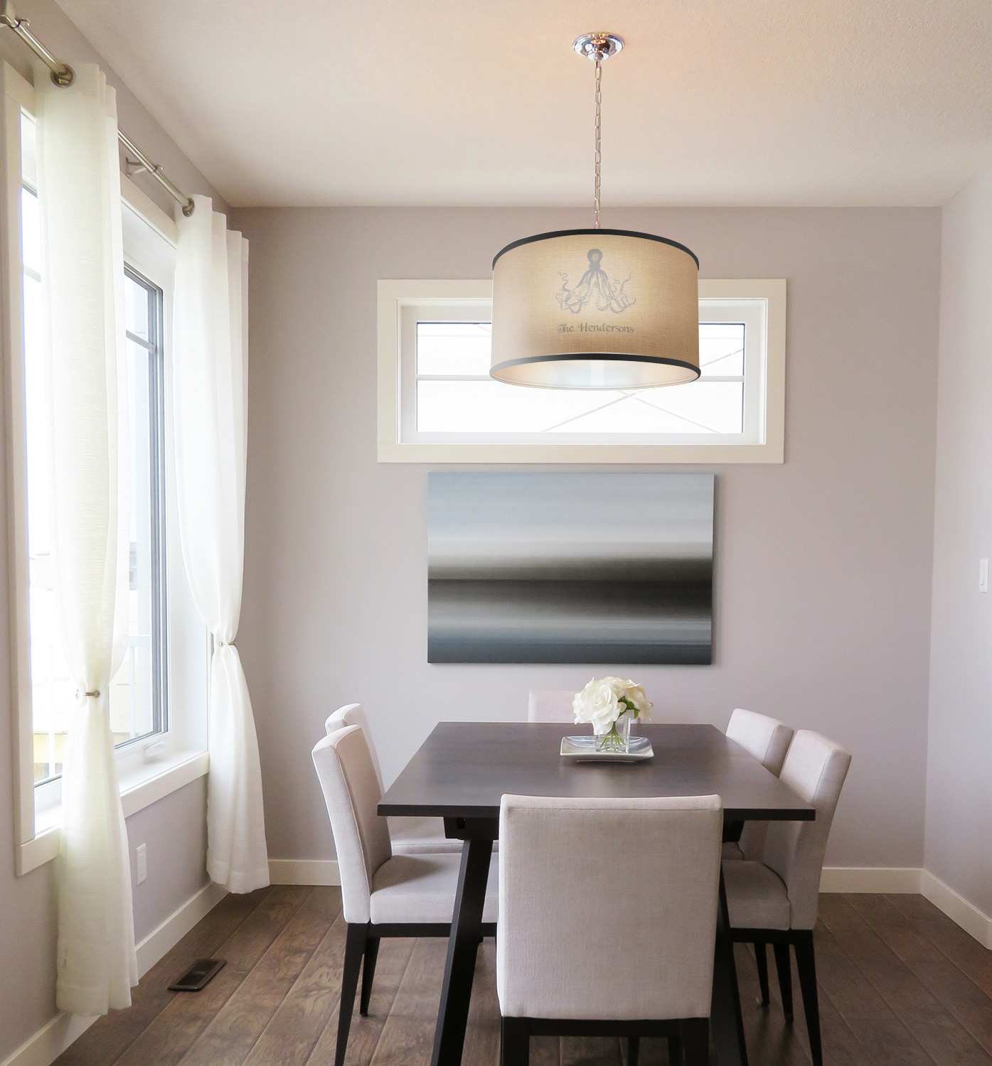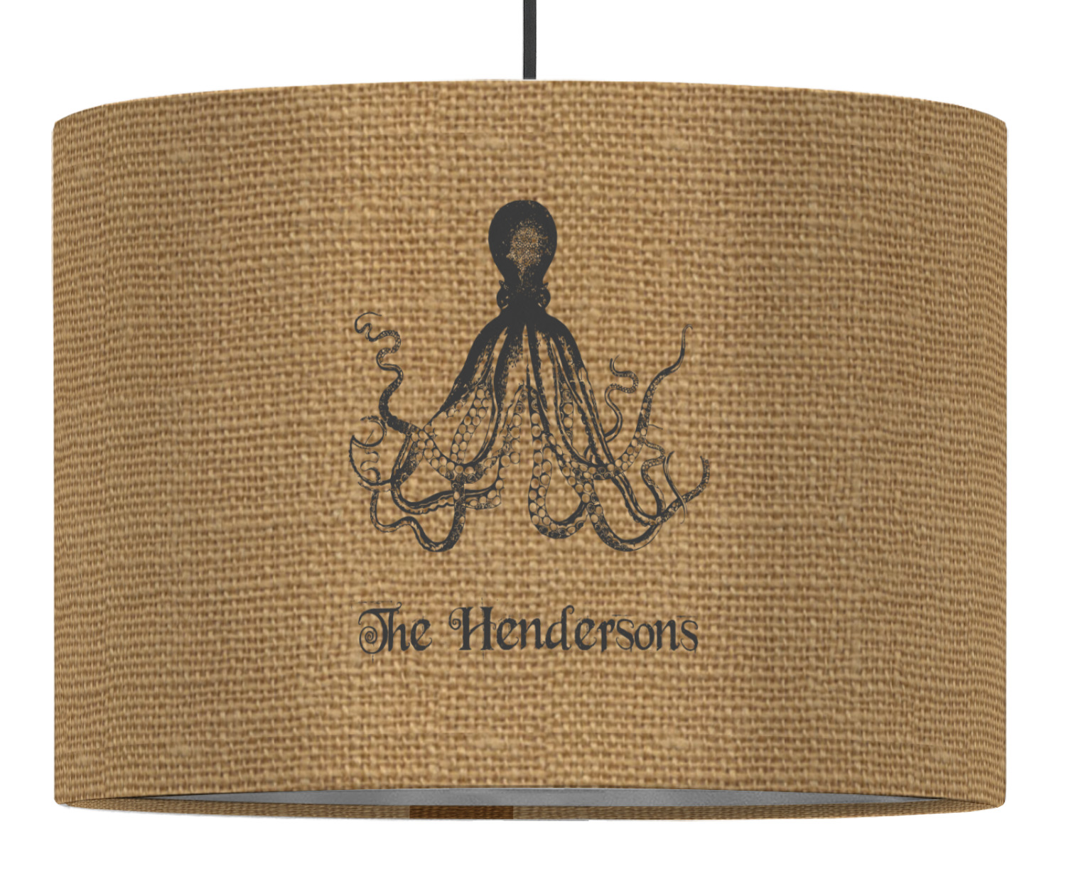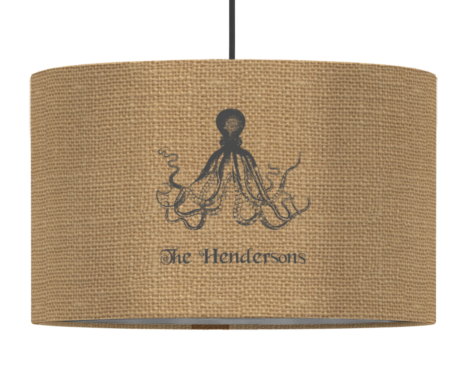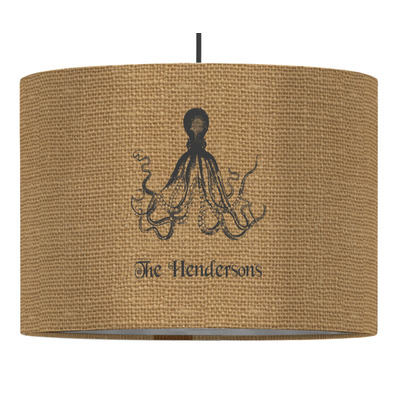 These pendant lampshades are in a cylindrical, drum shape. Available in 2 sizes - 16 inch diameter and a height of 10 inches or 12 inch diameter with a height of 8 inches, this lantern pendant light will not go unnoticed in your home. The interior of this light shade is made of flexible, smooth plastic, and the base color of the lamp is white. Your personalization is displayed on the exterior of this custom lampshade. The fabric shades the fabric fully wraps the ring for a sleek look. Your purchase includes a 12 foot long cord that has a convenient on and off switch attached, the cord is black in color with a tasteful cloth covering over the cord to add the sophisticated look to this light fixture. This lamp can fit a 60 or 75 watt light bulb, but the bulb is not included. Please scroll through the images above to learn more about the structure and shaping of this lamp compared to the other ones we offer.