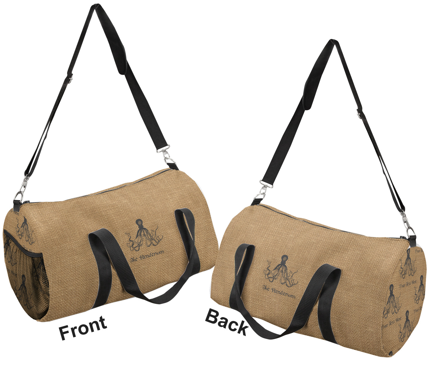 This duffle is a sturdy bag made of a canvas material. It comes in two sizes: Small (19"W x 9.5"H x 9.5"D) and Large (23"W x 12"H x 12"D). The bag is a cylindrical shape with a black adjustable strap and two handles. On one side is an elastic pouch to put a waterbottle or other small item. Your product will be sublimated with your design and is able to be designed on the front, back, and sides. Be sure to remember that the straps may cut into parts of your design if you upload your own artwork.