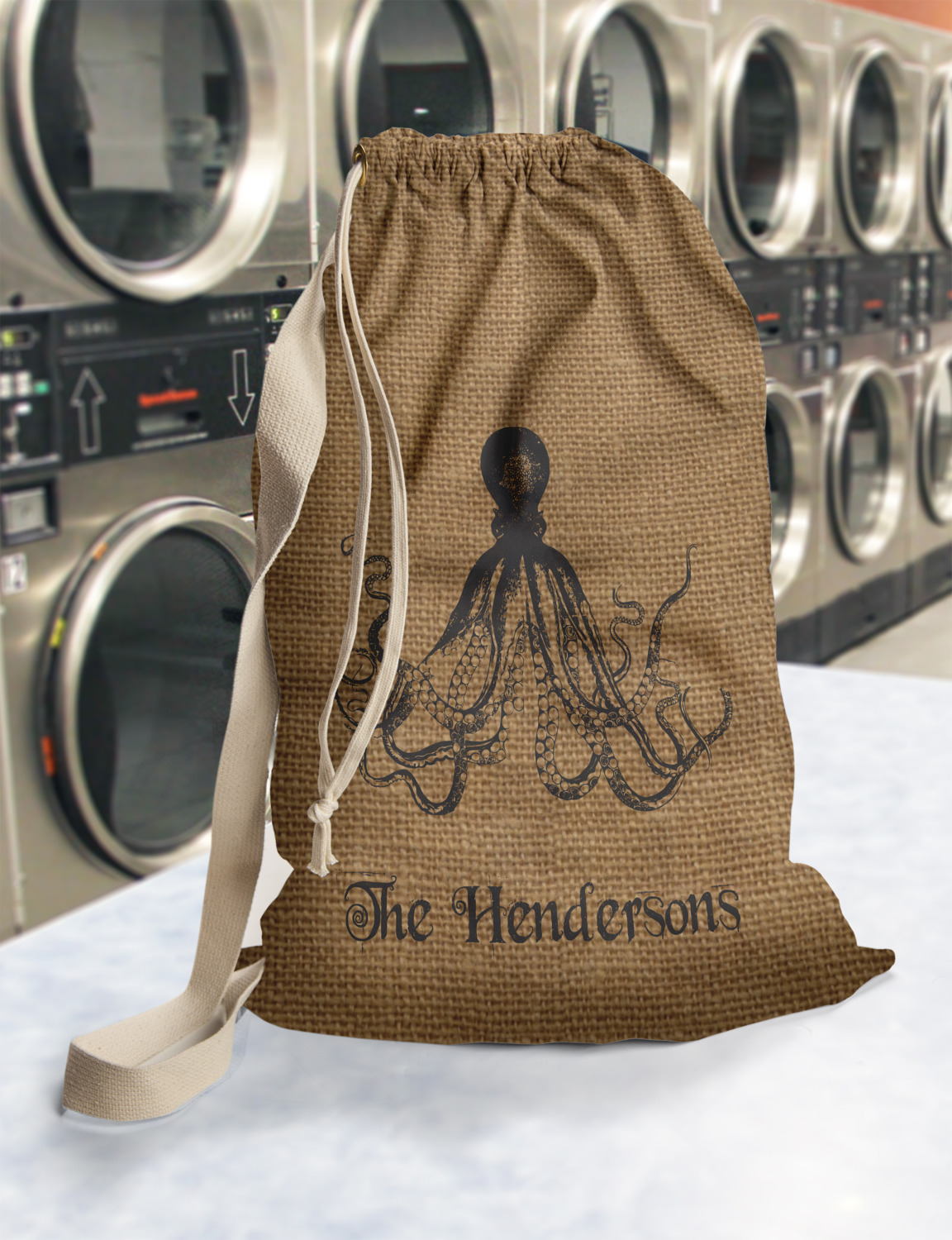 Carry your laundry in style with these customized laundry bags. Available in two sizes, featuring a natural colored woven strap and a cinch cord, these bags hold a lot of clothes or anything else you want to fit in them.