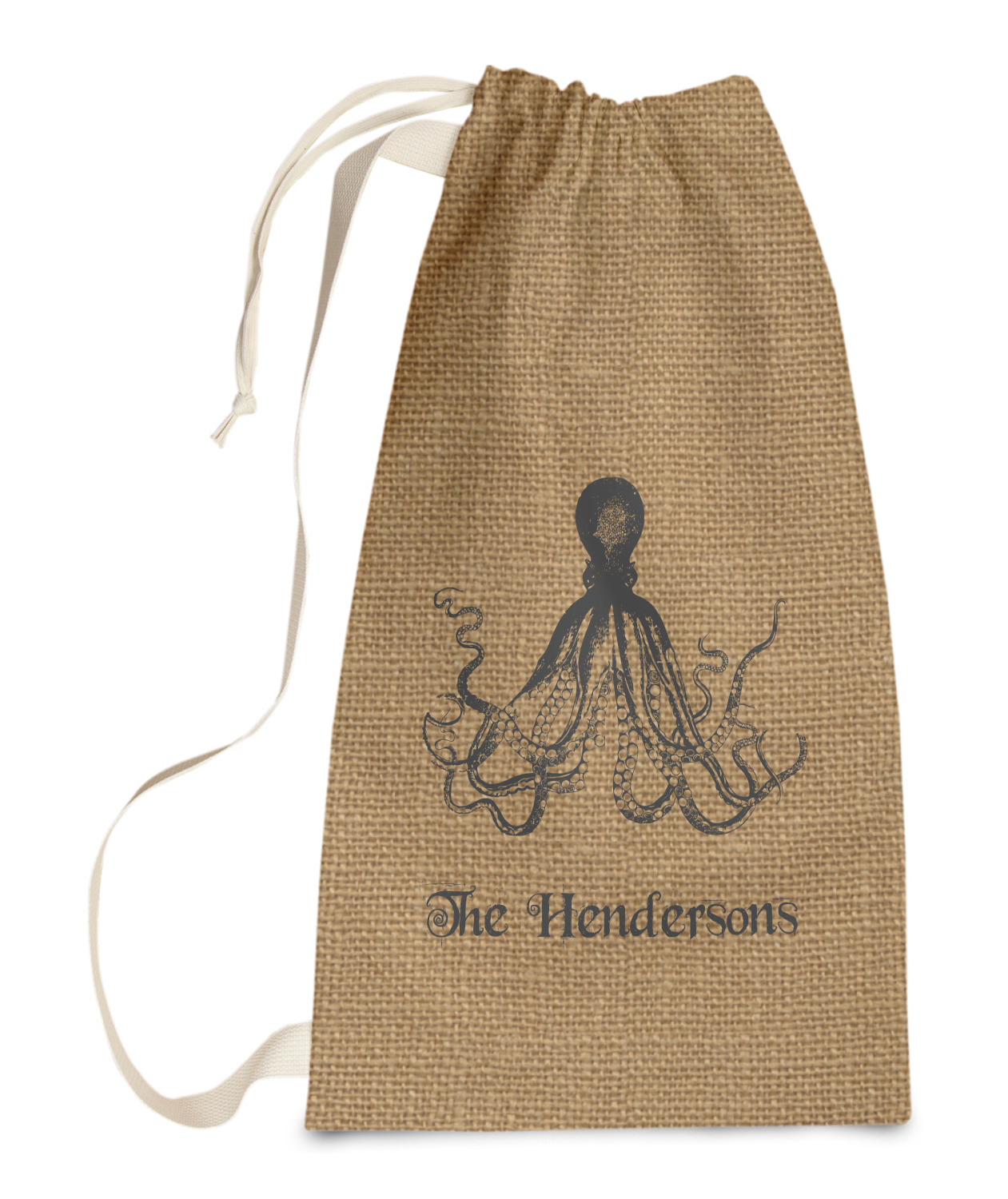 Carry your laundry in style with these customized laundry bags. Available in two sizes, featuring a natural colored woven strap and a cinch cord, these bags hold a lot of clothes or anything else you want to fit in them.