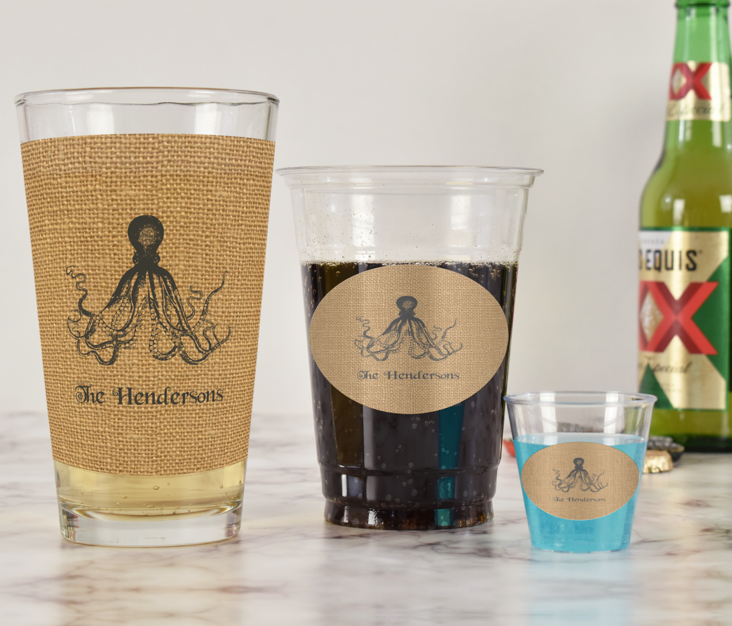 This design has a vintage octopus on burlap. It is a very chic and unusual design. We choose to use the traditional burlap color and the vintage octopus in a dark grey. Not only can you change the color of the burlap and the octopus, you can change the octopus as well. We have many different vintage designs that you can choose from such as sea horses, sea turtles, ships, anchors, compasses etc
