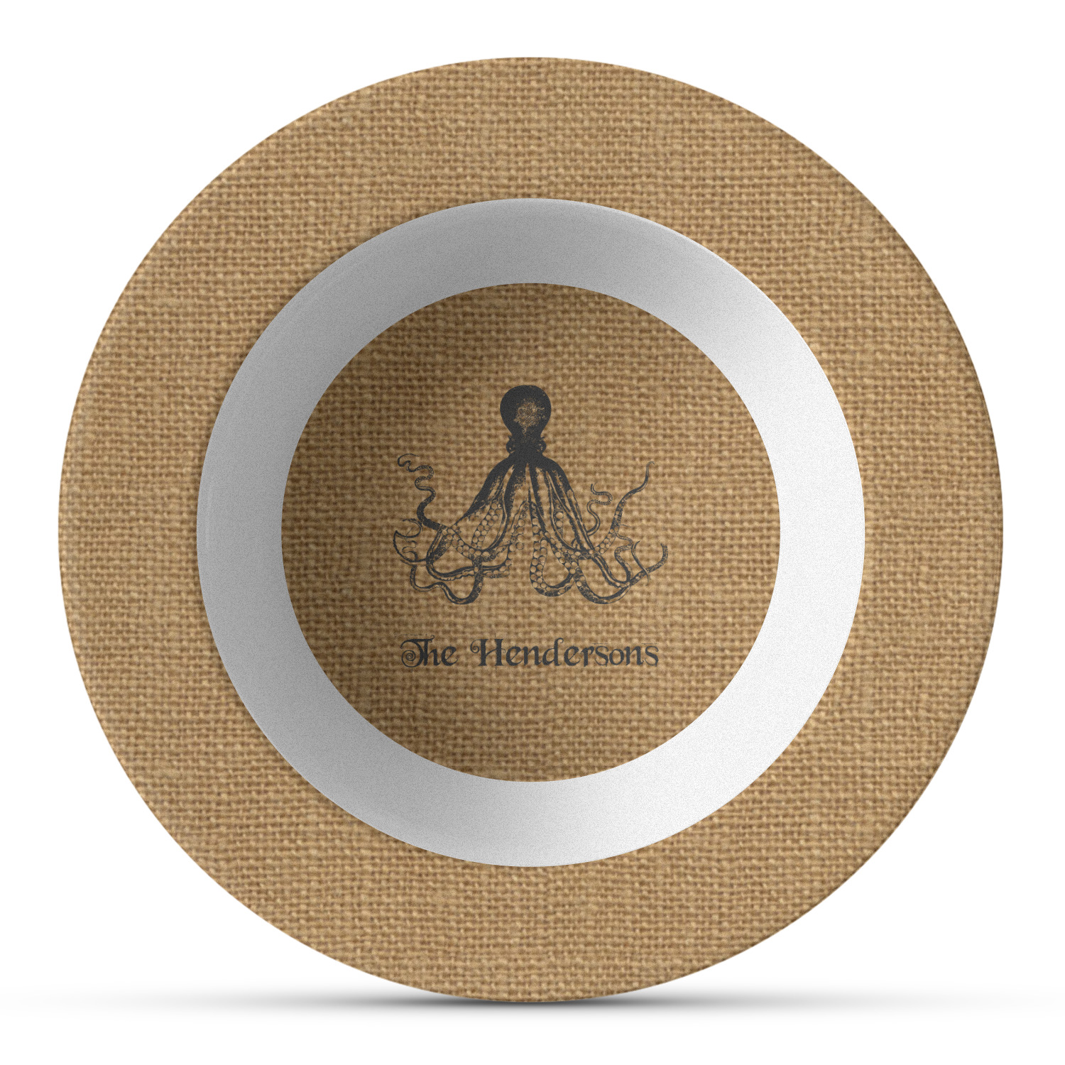 Made from a composite, thermo-set, polymer plastic, these dinner bowls have the versatility, durability, and weight of a melamine bowl without any of the downsides of melamine. Unlike melamine dinnerware, these bowls can withstand high heat. These custom plastic bowls can even handle temperatures of up to 250 degrees Fahrenheit, for up to 60 minutes. The pieces of our plastic dinner set are never made with harmful chemicals, such as BPAs, formaldehyde, DEHPs. We display your personalization on the base of this bowl's interior, while the bowl itself has an 8.75" diameter and is 1.75" tall.