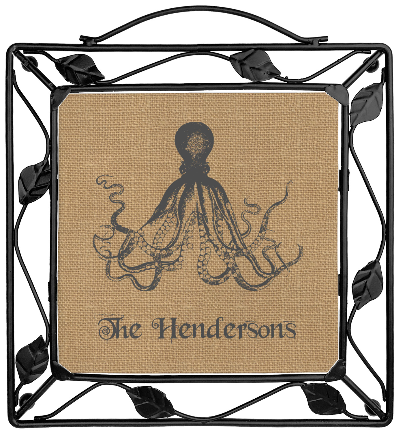 Our square trivets are made from a durable, wrought iron. This model features 4 small half circles, one on each corner, and a larger ring of iron that circles the central, customized tile. Each of the 4 corners has a round foot on its bottom for stability. This trivet is 8.75 by 8.75 inches, but the central tile measures at 6 inches on both sides.