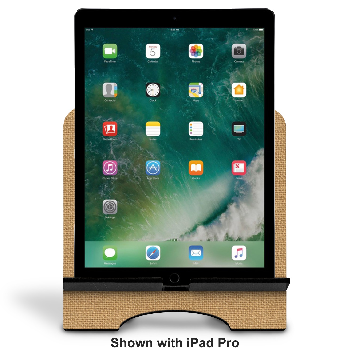 The stand is comprised of two hardboard pieces that fit snugly together and stabilize one another. The bottom part of the iPad stand supports your tablet, and has space for your tablets charger while in use. At 9.25" x 11.5", this tablet mount can support a device between the sizes of the iPad Pro and the iPad Mini 2. The uppermost part of the stand features a decorative, curved edge for a classy, suave appearance. We print your customization atop the face of the stand, in vibrant color. The remaining sides are colored a sleek black.