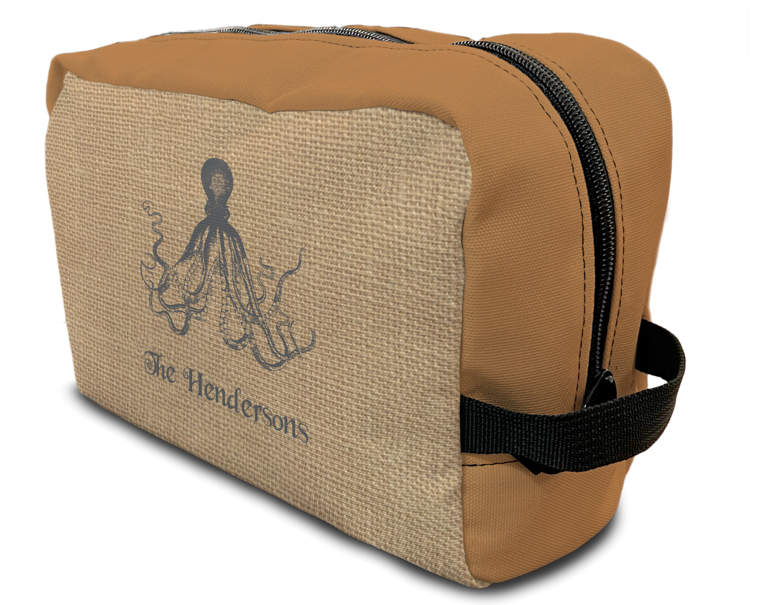 Our toiletry bag has the traditional dopp kit design i.e. a side to side zippered closure, giving you easy access to all the contents inside and a sturdy handle on one side of the bag. The canvas fabric for dopp kits is printed, then cut and sewn here in the USA.