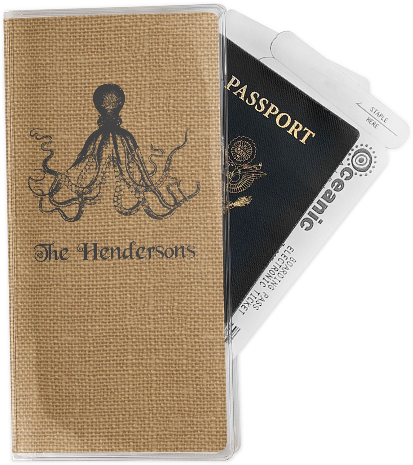 This document holder is really sturdy and has your personalized design inserted right behind all of your nifty pockets, so you can see it on the front and back covers. There are two large pockets and two shorter pockets inside. The larger pockets are tall enough to keep your boarding pass nice and straight. The smaller pockets (on top of the large pockets) are large enough to fit your passport, credit card, or ID.