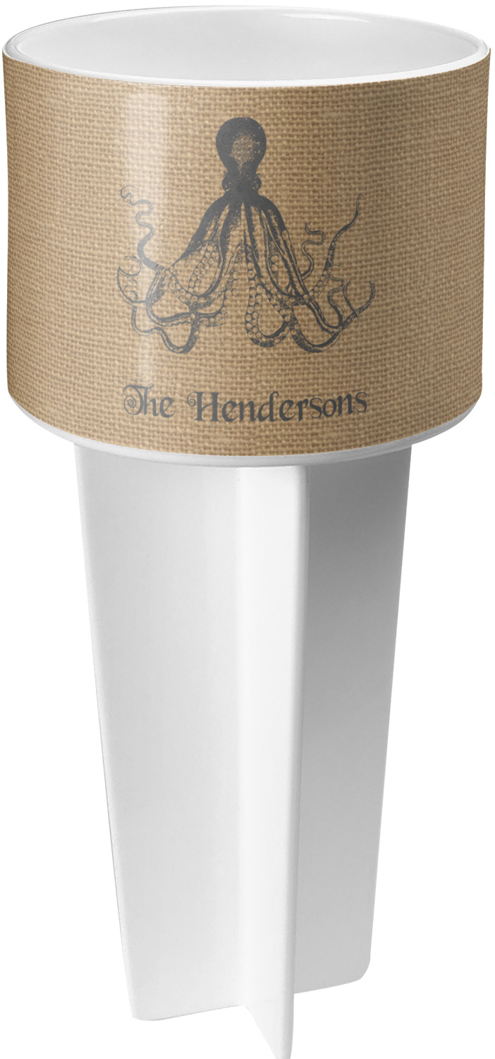 This cup holder has a large stake at its bottom that anchors it to the sand or ground below, while the cup holder rests above the stake. The entire drink holder is made of durable plastic and displays your customization around the cup holder portion. We sell these personalized beach spikers in two different colors: black and white.