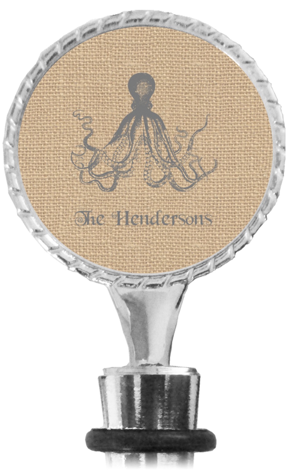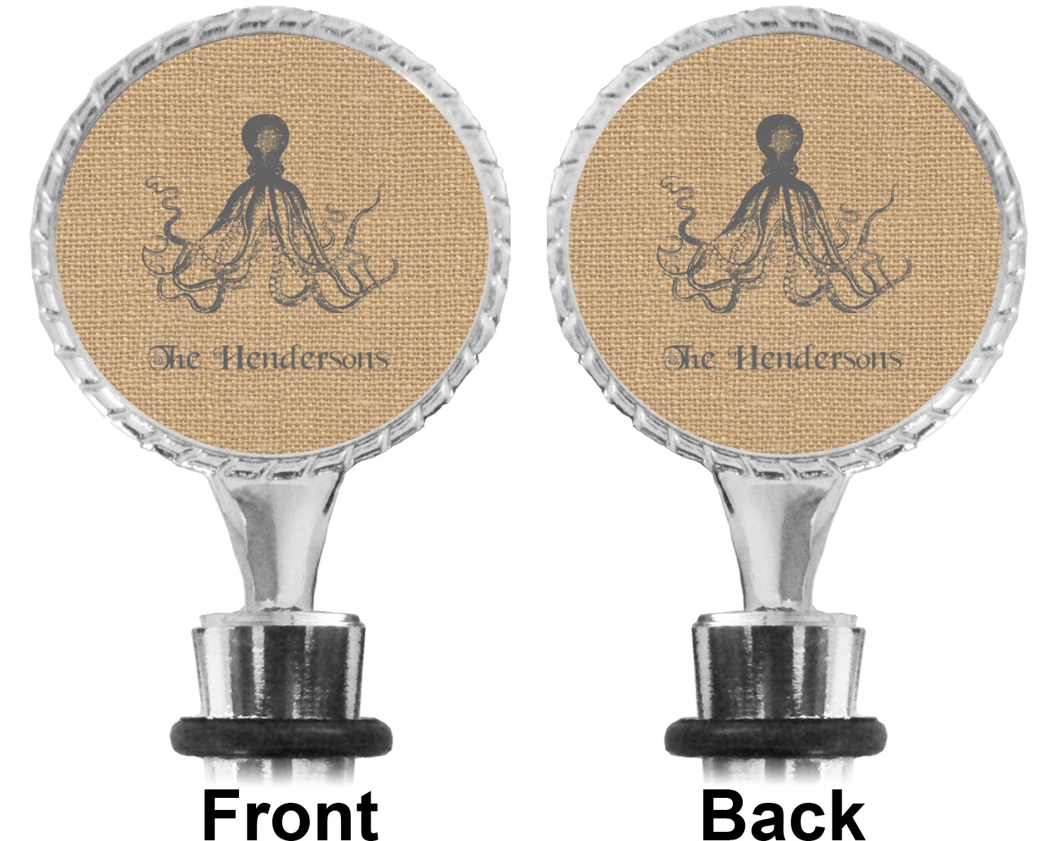 The top part of your bottle stopper is comprised of a zinc ring that displays your customization(s) in its middle, on both sides. The ring is heavy duty, with a bright chrome finish. The body of the wine stoppers have two silicone rings to provide an airtight seal. These wine bottle stoppers measure at 1.625" L x 0.8125" W x 4.625" H; your custom wine stopper is meant to fit into most standard-sized wine bottles.