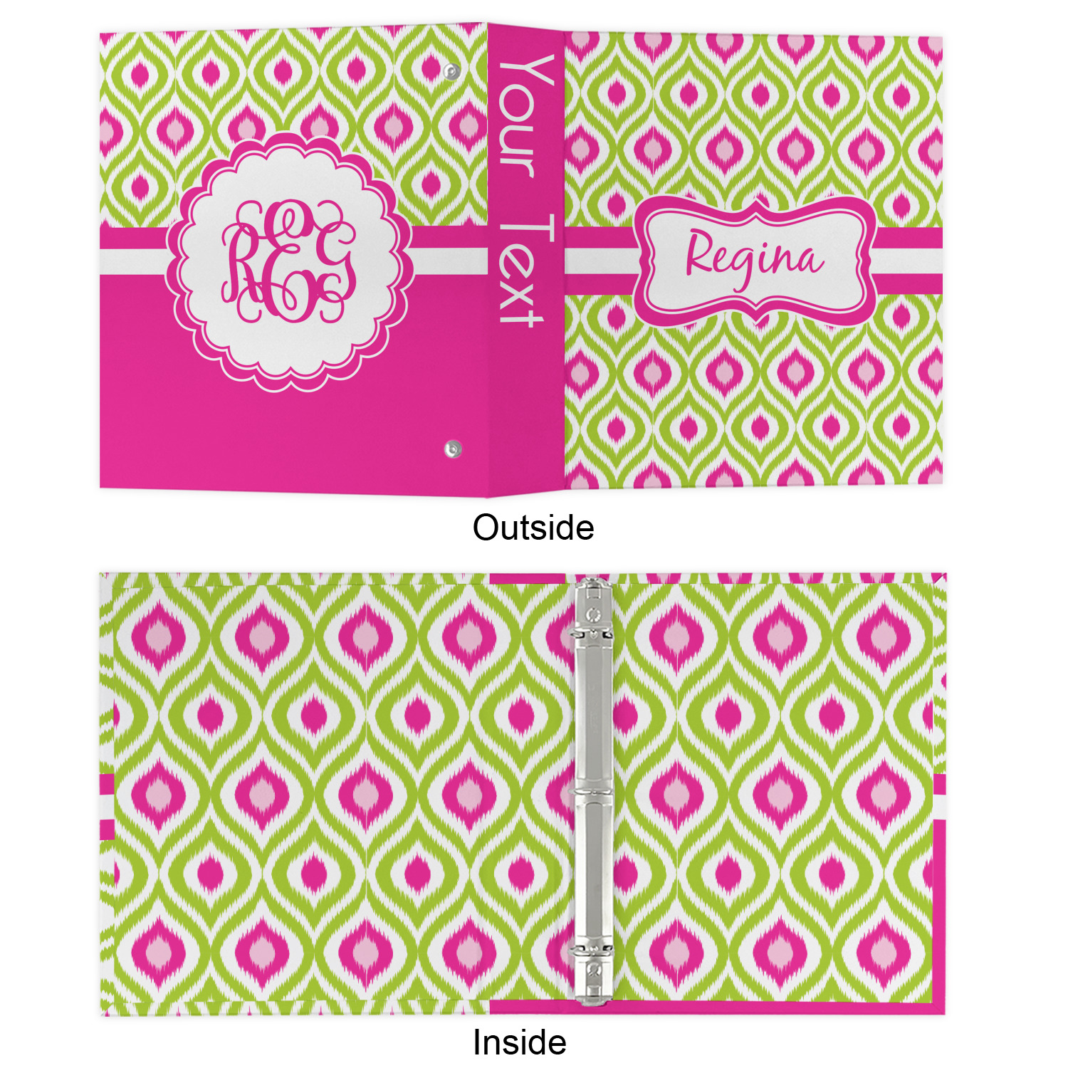 The outside is printed in 3 sections - front cover, spine and back cover - while the inside is printed in a full single print of your choice. The inside boasts a high quality nickel plated binder mechanism with a trigger opening function and is secured to the cardboard binder with posts and screws.