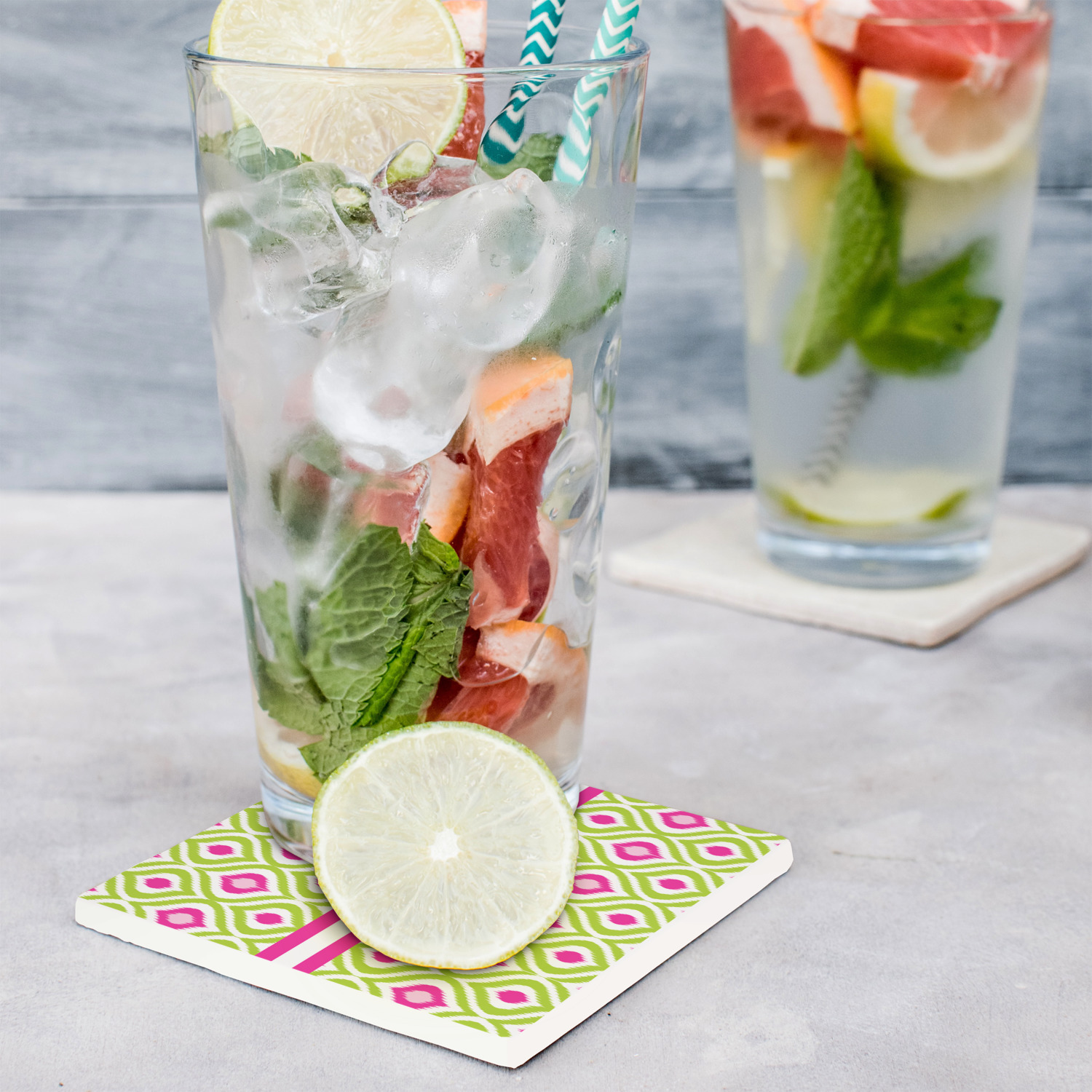 These customized stone coasters are perfect for use with beverages that are served in drinkware that "sweat". When cocktails, sodas, iced tea, water, etc. are served with ice in a regular glasses (non insulated glasses), they release condensation that drips down the outside of the glasses.