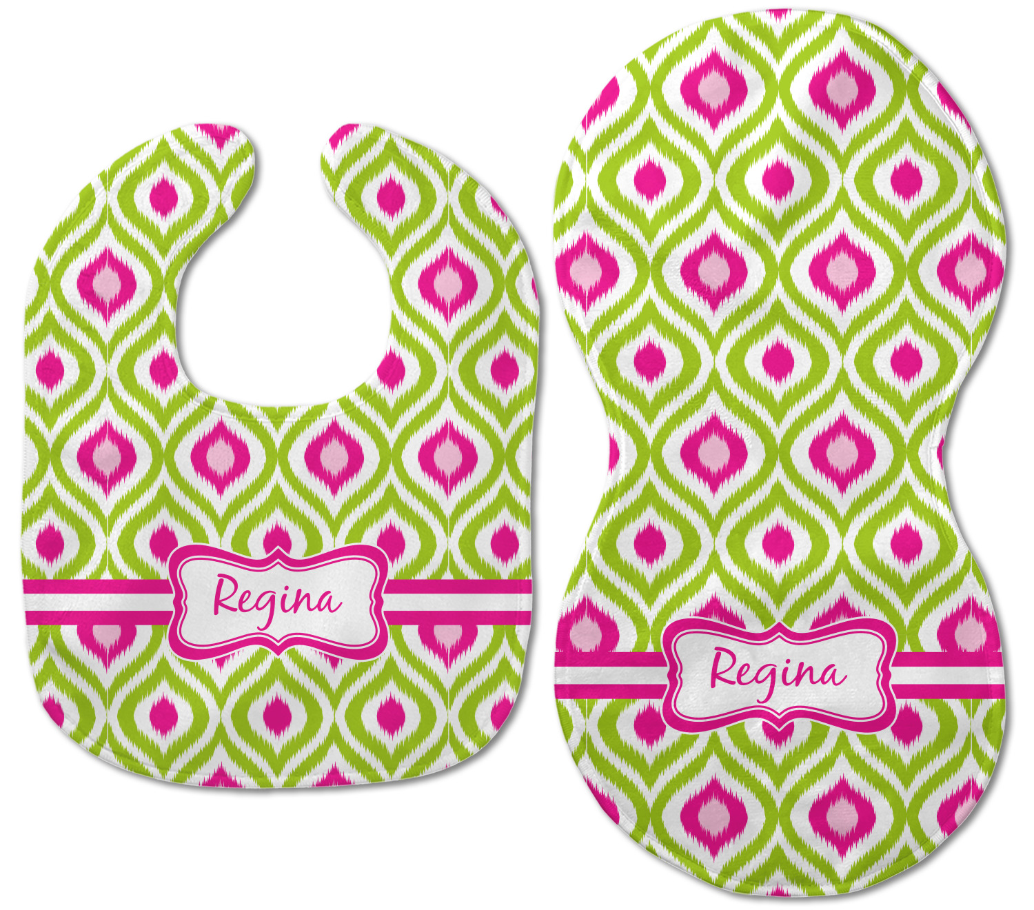 Looking for a girly girl design. The pink and green ikat print with a decorative label is as girly as it gets. We have created this ikat pattern in lime green, orchid pink and hot pink. For all of us girly girls and princesses, this is our absolute favorite!