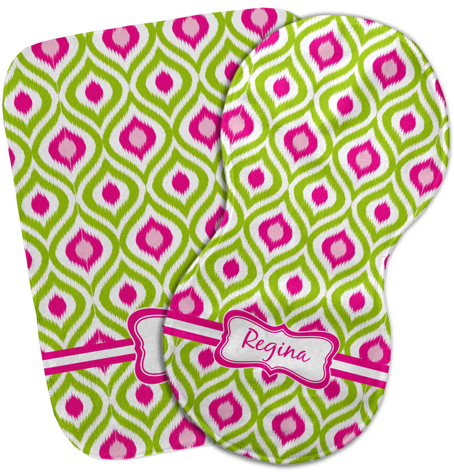 Looking for a girly girl design. The pink and green ikat print with a decorative label is as girly as it gets. We have created this ikat pattern in lime green, orchid pink and hot pink. For all of us girly girls and princesses, this is our absolute favorite!