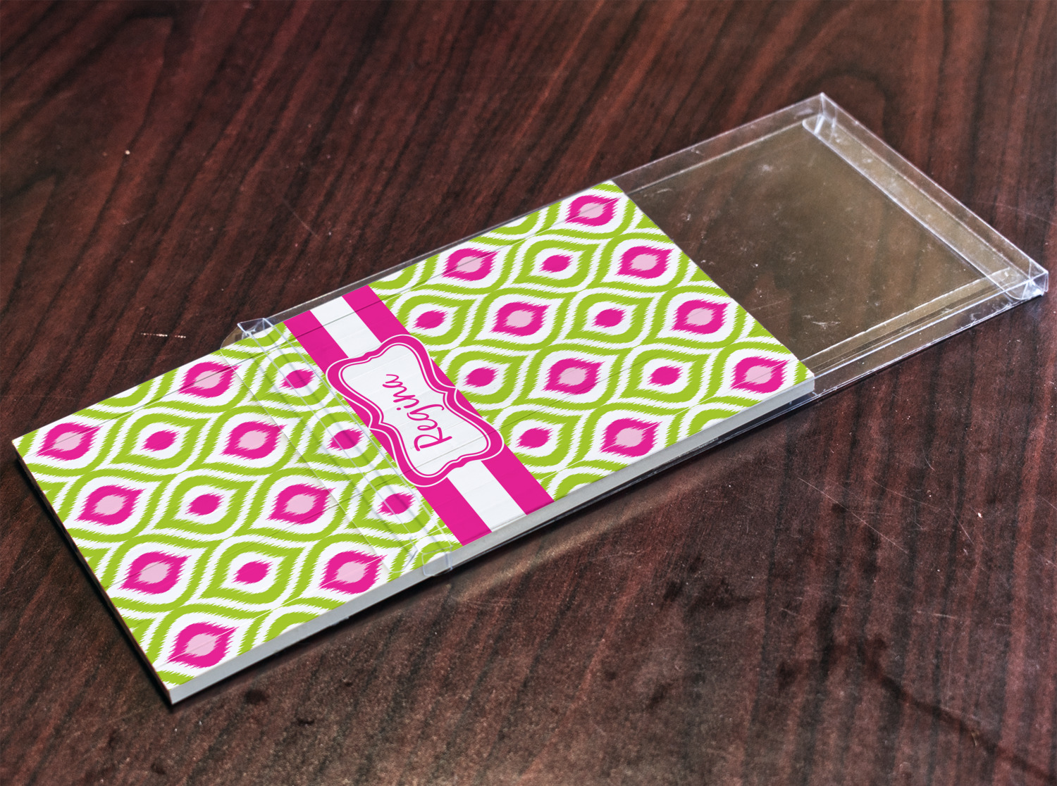 Looking for a girly girl design. The pink and green ikat print with a decorative label is as girly as it gets. We have created this ikat pattern in lime green, orchid pink and hot pink. For all of us girly girls and princesses, this is our absolute favorite!