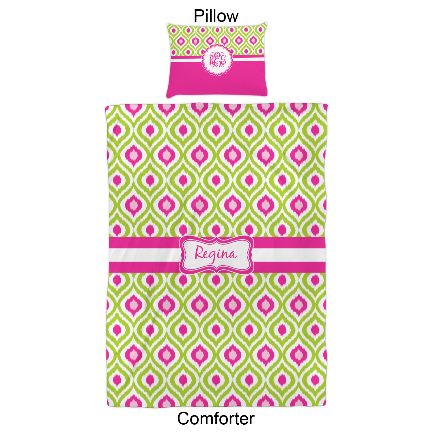 Looking for a girly girl design. The pink and green ikat print with a decorative label is as girly as it gets. We have created this ikat pattern in lime green, orchid pink and hot pink. For all of us girly girls and princesses, this is our absolute favorite!