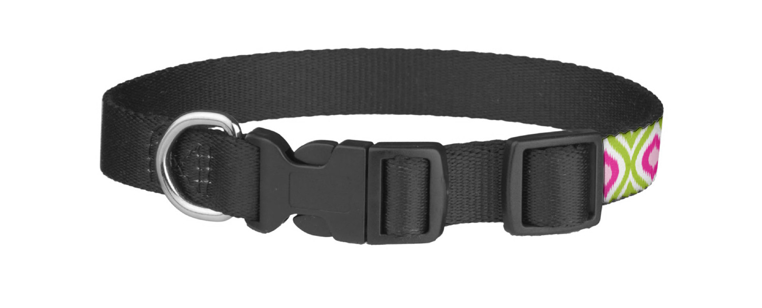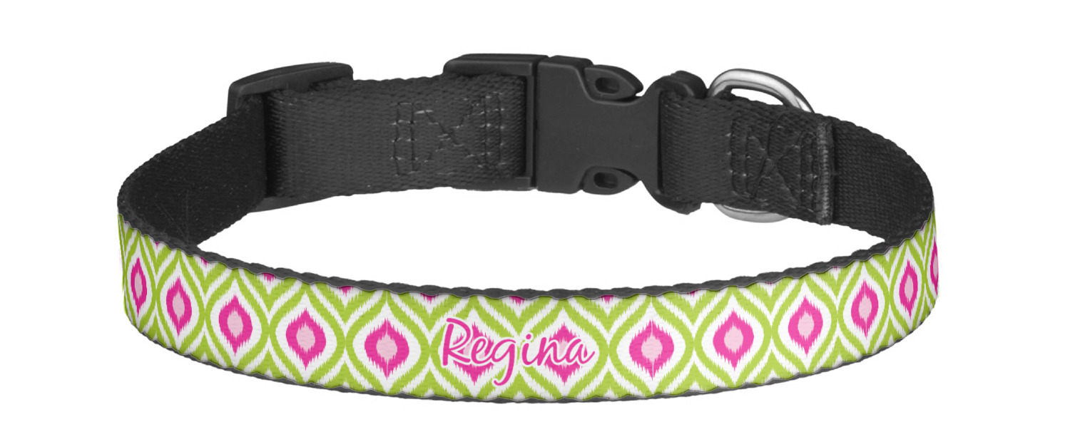 This sturdy collar, made from a durable nylon weave, will outlive your dog's episodes of excited tugging and pulling. Courtesy of its thick plastic buckle and adjuster, this collar is adjustable and accommodating of any dog. Structurally, the collar is a single piece of nylon weave that is sewn together, and features a solid metal loop where you can attach a leash or dog tag. We print and display your dog's name and pattern across the middle of the personalized dog collar.