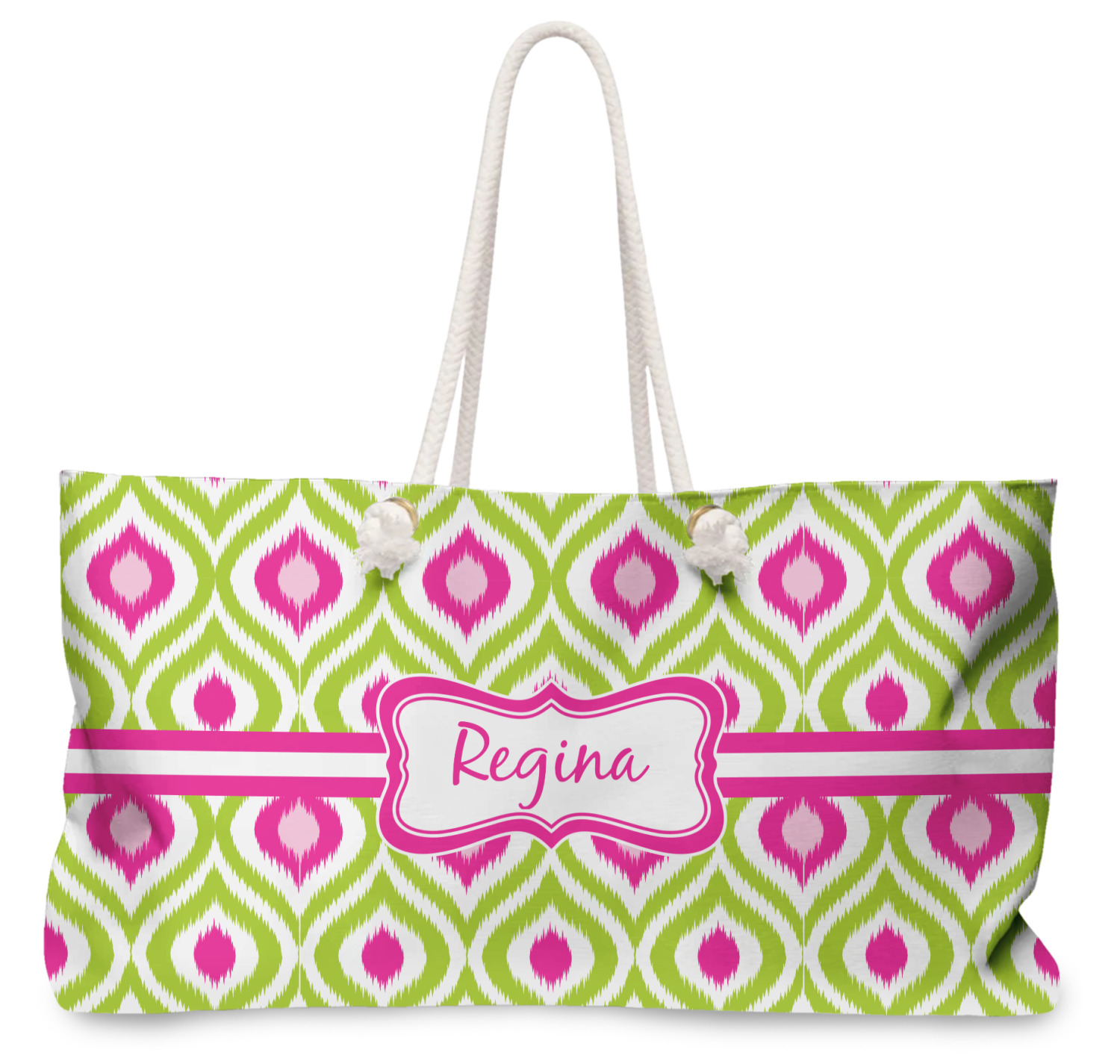 Our oversized weekender tote with rope handles is perfect for your weekend at the beach or on the town. This large tote are 24" W X 13" H, with a 5" gusset and a 27" thick rope handles with a knot that is put through a grommeted brass hole.