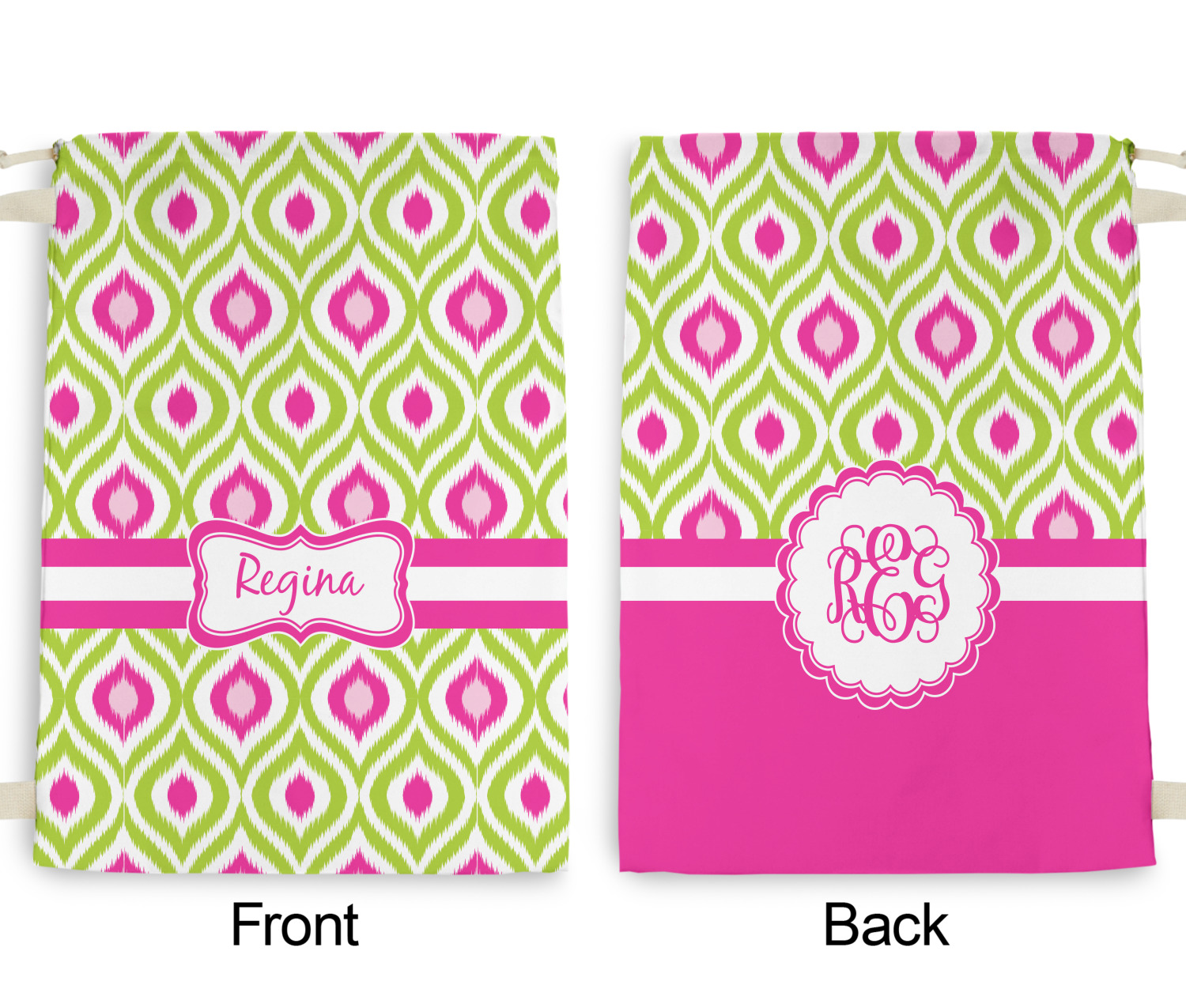 Looking for a girly girl design. The pink and green ikat print with a decorative label is as girly as it gets. We have created this ikat pattern in lime green, orchid pink and hot pink. For all of us girly girls and princesses, this is our absolute favorite!
