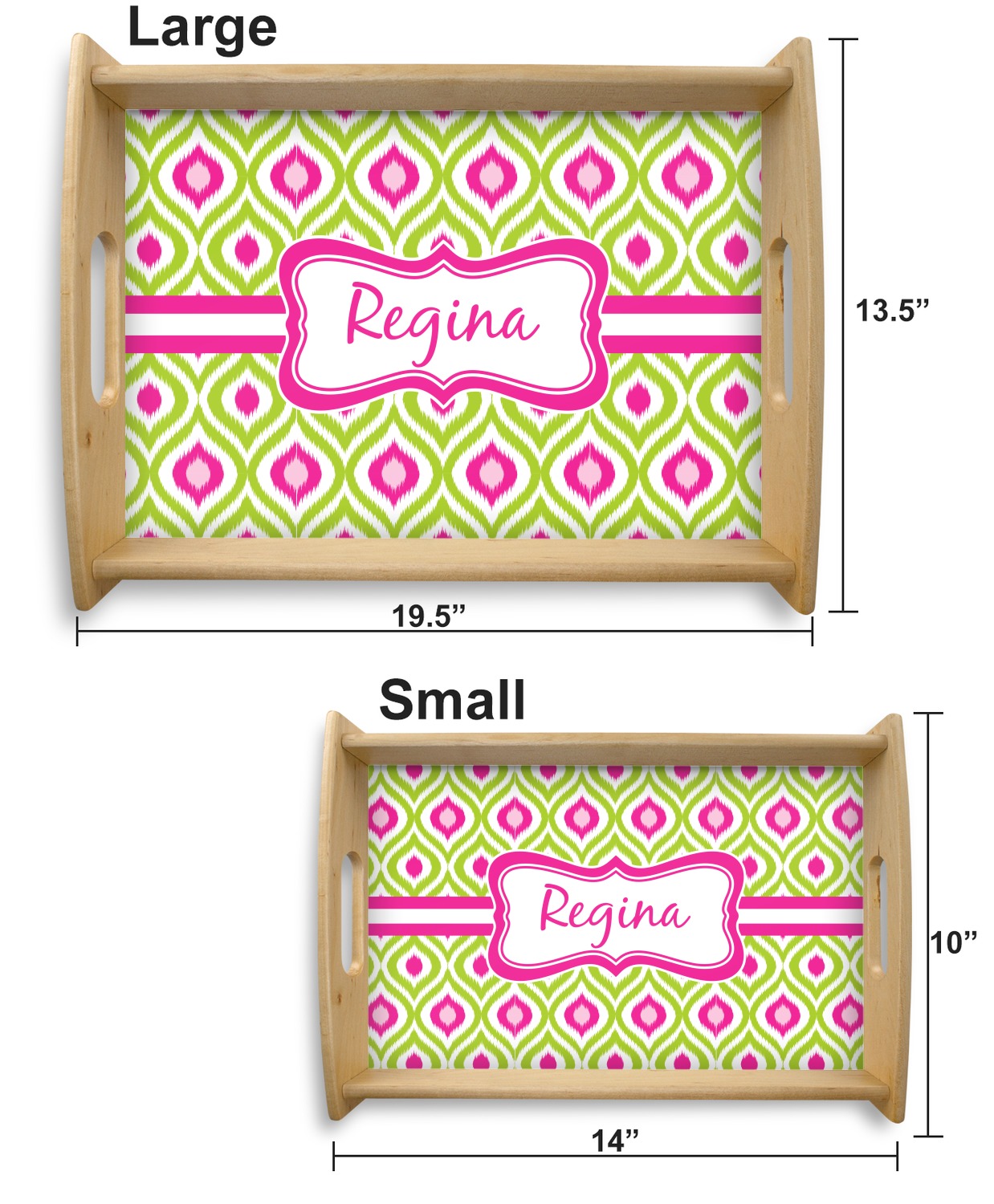 This serving tray with handles features square edges and two rounded sides, creating a very modern look. Each side is fabricated from a beautifully cut, natural wood. The bottom of the interior of the tray displays your customized design in bright, vibrant color. The tray is sold in both a black color and a natural wood look. Each variation of the wood serving tray has two sizes: Small, which is 14" x 10" x 2.25", and Large, which is 19.5" x 13.5" x 2.75".