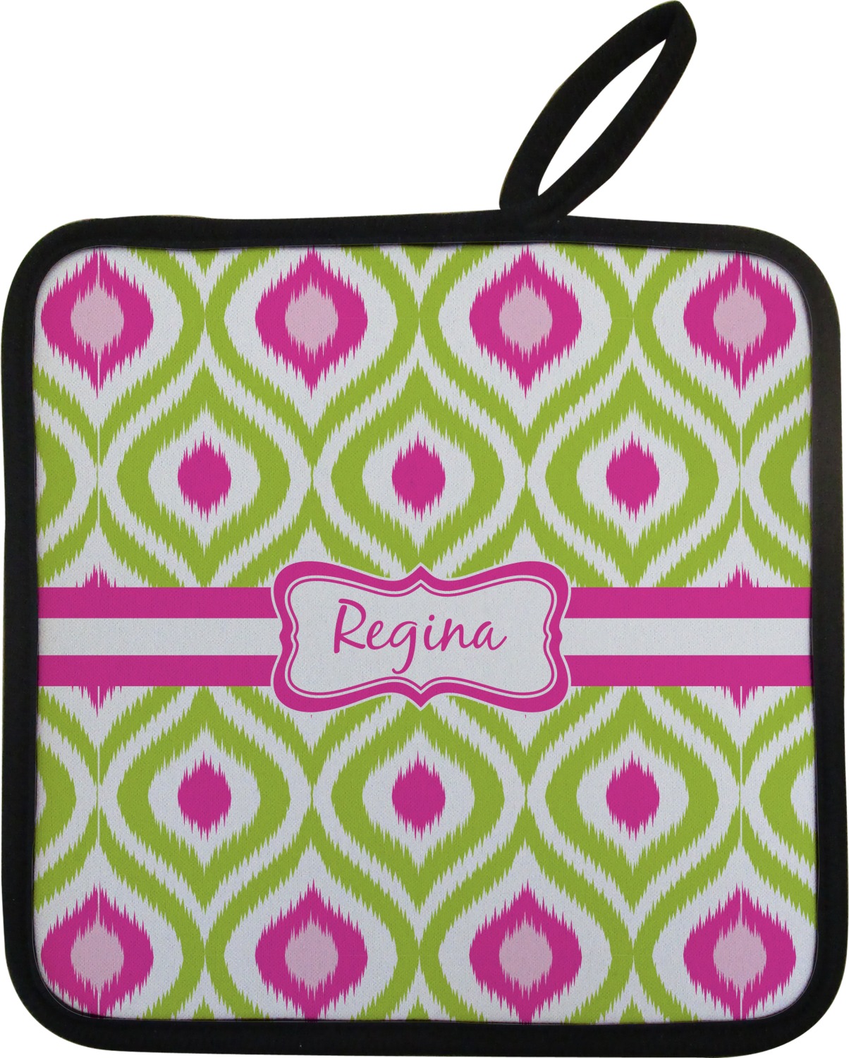 Along with our heat resistant gloves, we also carry personalized pot holders. These pot holders also feature a neoprene front that displays your personalization, and a textured, rubber backing for a sturdy grip. The two materials are connected with a sleek, black trim, and the hot pot holder also includes an attached loop for hanging and storage. You can purchase a kitchen pot holder by itself, or alongside a right or left oven mitt, depending on your needs. The pot holder itself is approximately 8.75 inches by 8.75 inches and 0.25 inches tall.