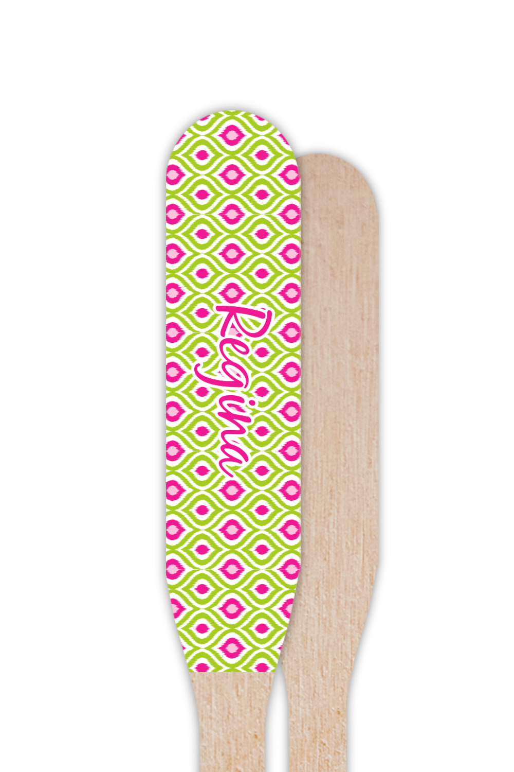 Looking for a girly girl design. The pink and green ikat print with a decorative label is as girly as it gets. We have created this ikat pattern in lime green, orchid pink and hot pink. For all of us girly girls and princesses, this is our absolute favorite!