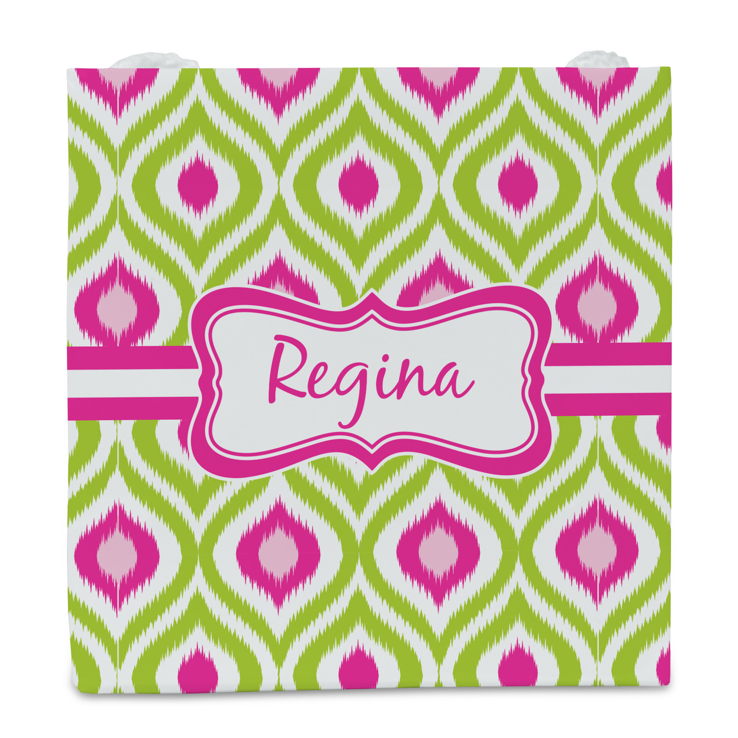 Looking for a girly girl design. The pink and green ikat print with a decorative label is as girly as it gets. We have created this ikat pattern in lime green, orchid pink and hot pink. For all of us girly girls and princesses, this is our absolute favorite!