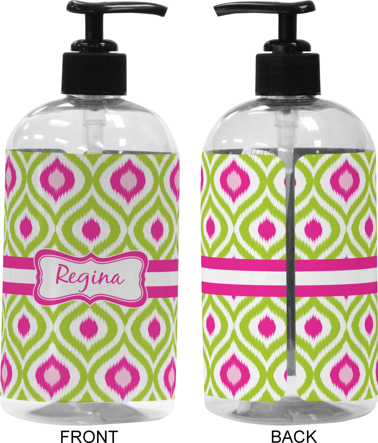 Looking for a girly girl design. The pink and green ikat print with a decorative label is as girly as it gets. We have created this ikat pattern in lime green, orchid pink and hot pink. For all of us girly girls and princesses, this is our absolute favorite!