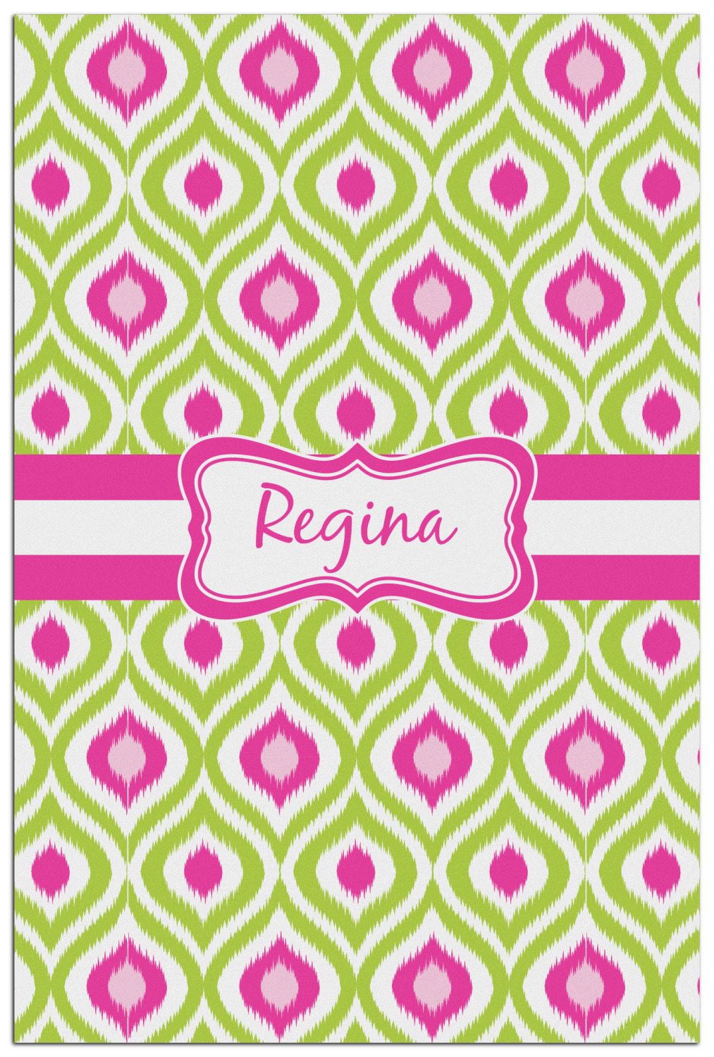 Looking for a girly girl design. The pink and green ikat print with a decorative label is as girly as it gets. We have created this ikat pattern in lime green, orchid pink and hot pink. For all of us girly girls and princesses, this is our absolute favorite!