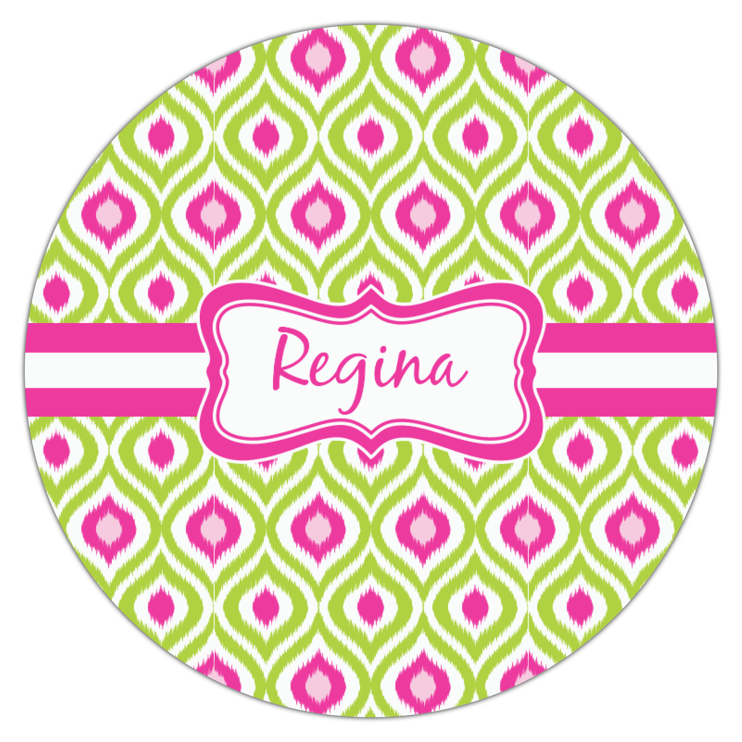 Looking for a girly girl design. The pink and green ikat print with a decorative label is as girly as it gets. We have created this ikat pattern in lime green, orchid pink and hot pink. For all of us girly girls and princesses, this is our absolute favorite!