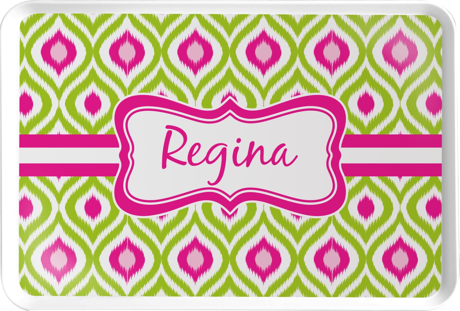 Looking for a girly girl design. The pink and green ikat print with a decorative label is as girly as it gets. We have created this ikat pattern in lime green, orchid pink and hot pink. For all of us girly girls and princesses, this is our absolute favorite!