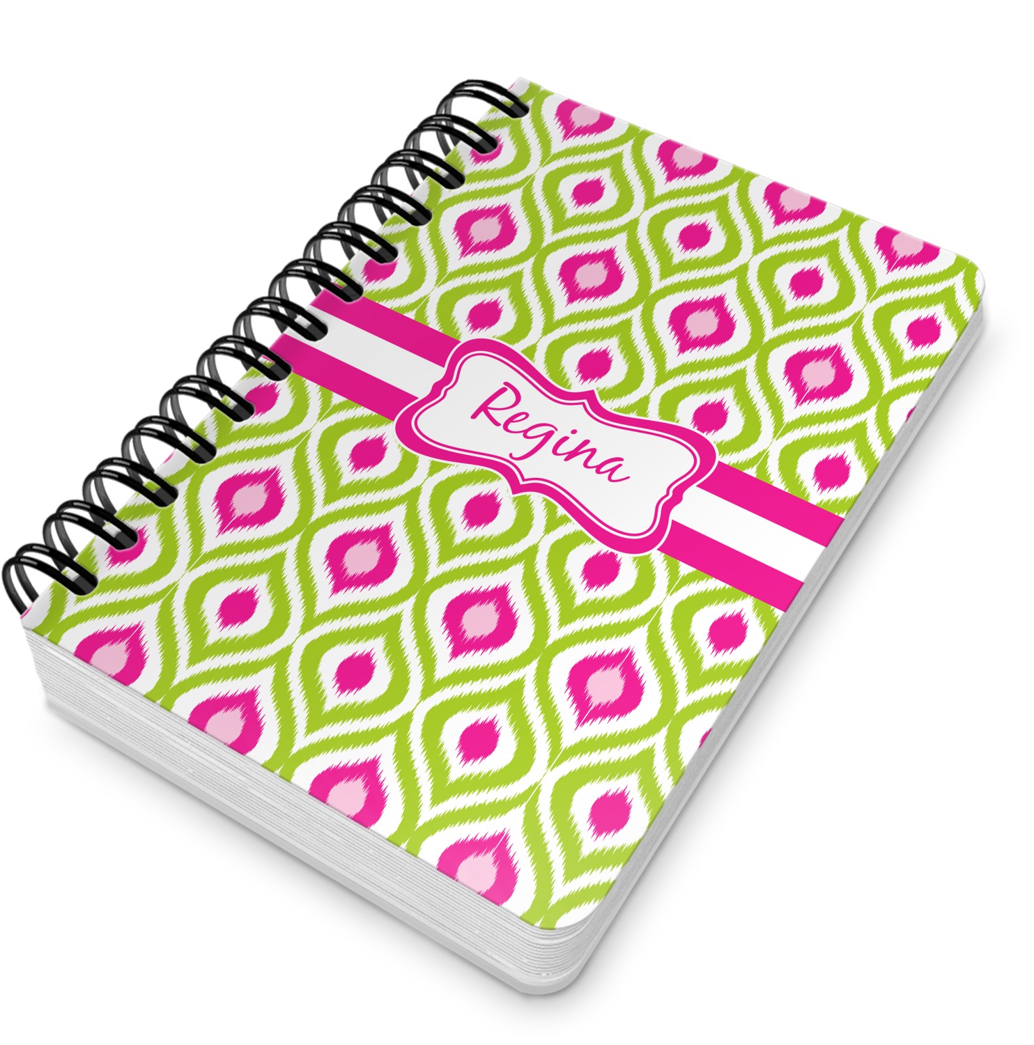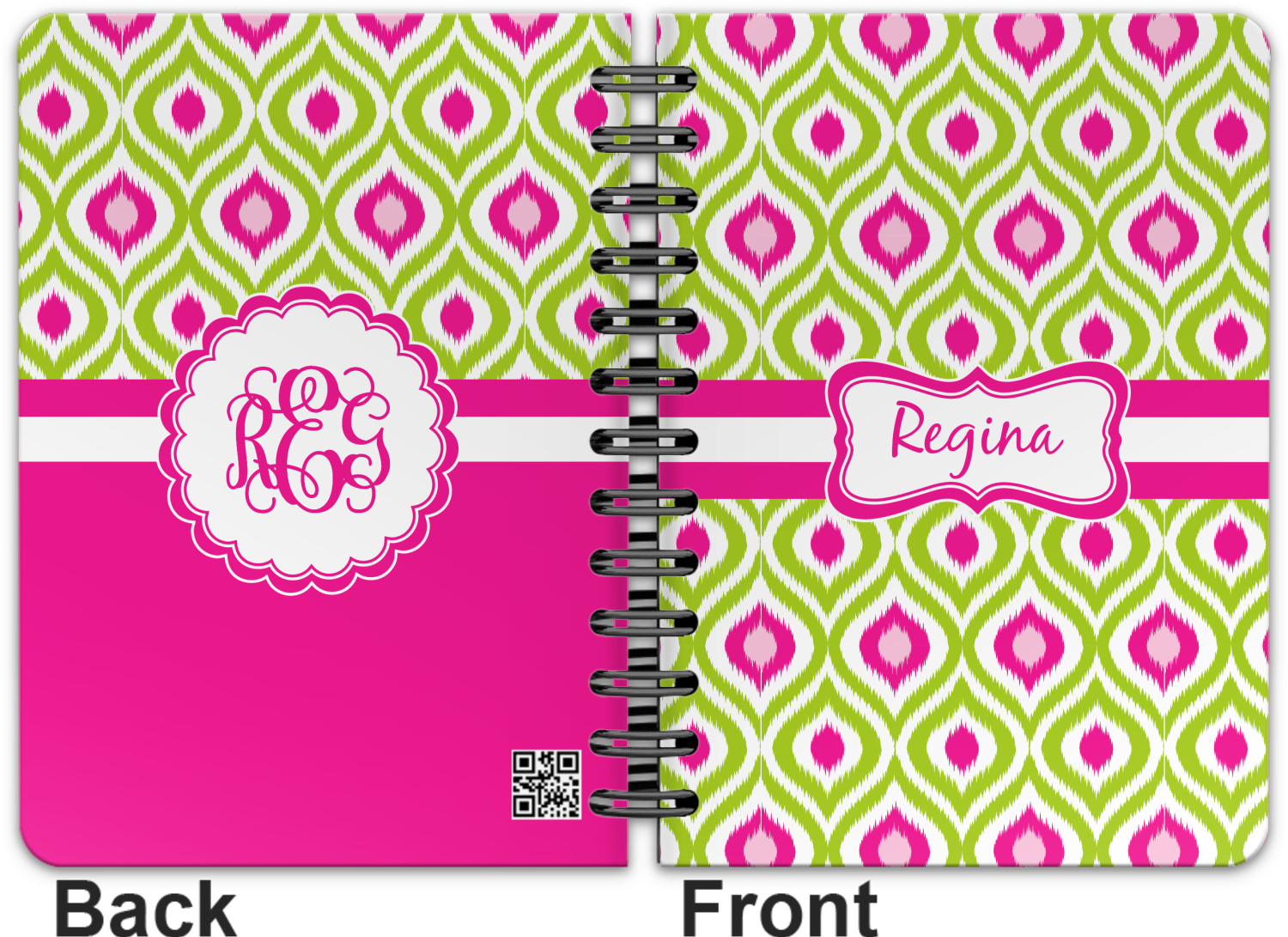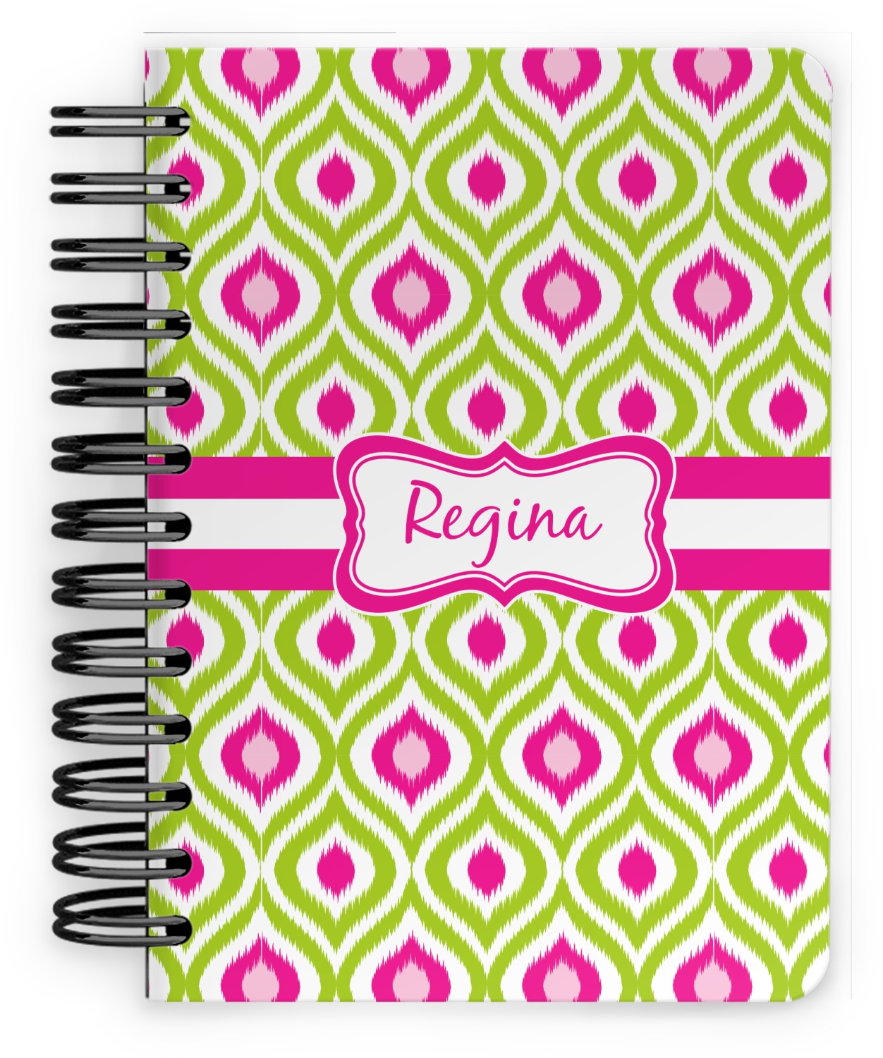This spiral notebook includes 75 sheets of thick, ruled paper. The front and back of this custom notebook is made of a robust, laminate, plastic covering. We print your personalization on these two panels, underneath a glossy finish, which emphasizes the colors of your design. The two panels and the sheets of paper are held together by a sturdy, black coil. The paper within your bound notebook is perforated for easy, clean tearing.