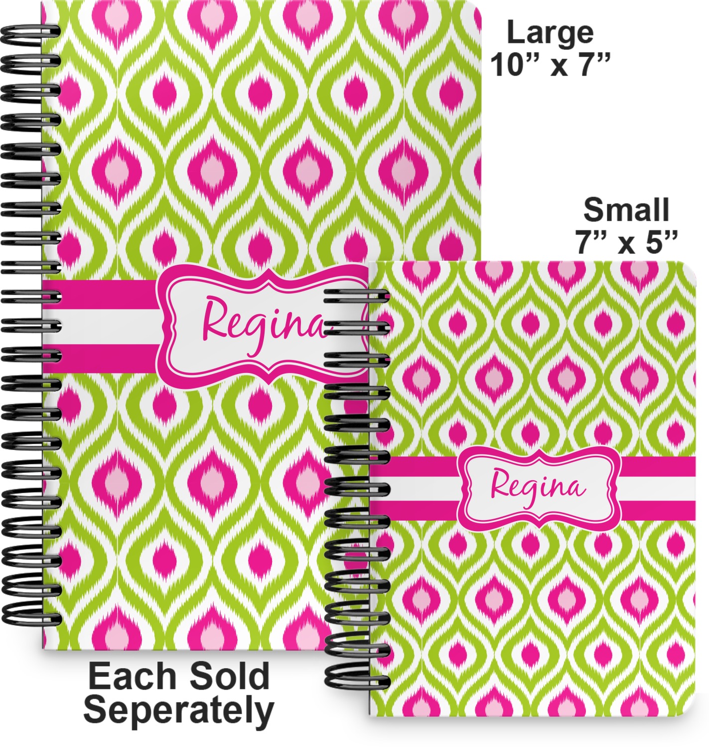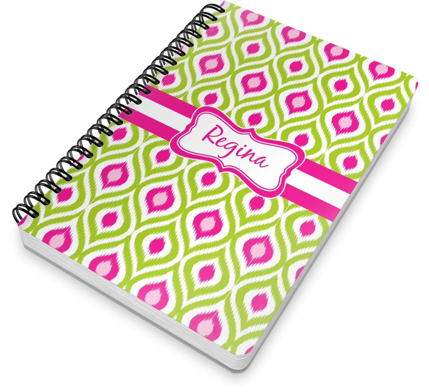 This spiral notebook includes 75 sheets of thick, ruled paper. The front and back of this custom notebook is made of a robust, laminate, plastic covering. We print your personalization on these two panels, underneath a glossy finish, which emphasizes the colors of your design. The two panels and the sheets of paper are held together by a sturdy, black coil. The paper within your bound notebook is perforated for easy, clean tearing.