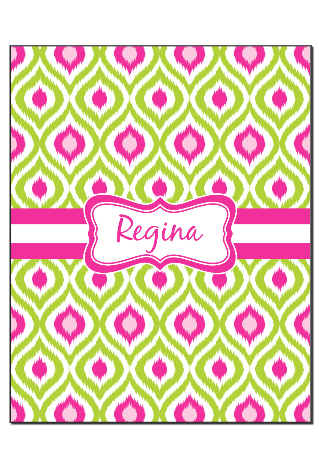Looking for a girly girl design. The pink and green ikat print with a decorative label is as girly as it gets. We have created this ikat pattern in lime green, orchid pink and hot pink. For all of us girly girls and princesses, this is our absolute favorite!
