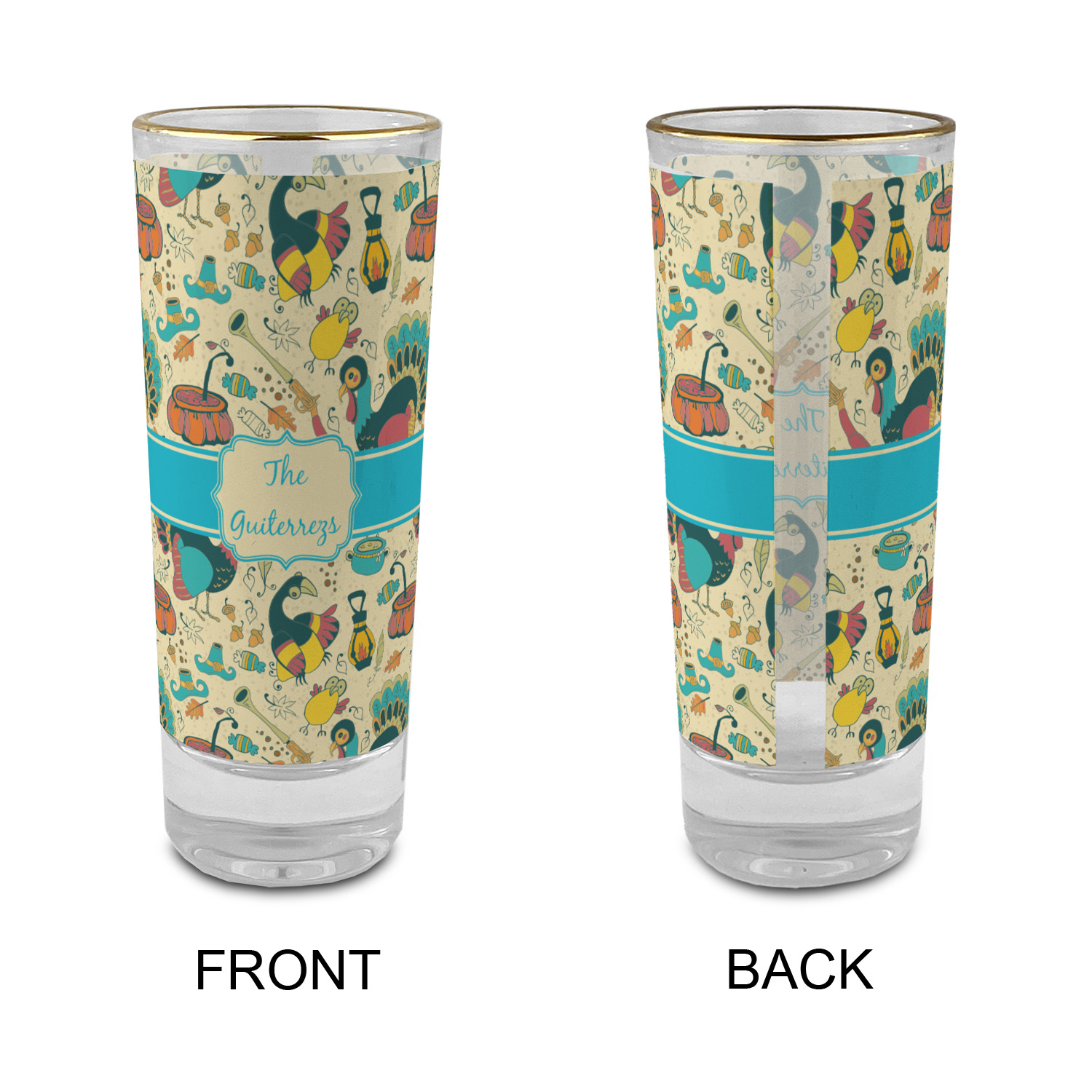 These glass shooter glasses are printed in full color with the design of your choice. These are a tall shooter 2 oz size and stand 4" tall. The print is a full wrap design to boldly display your personalization.