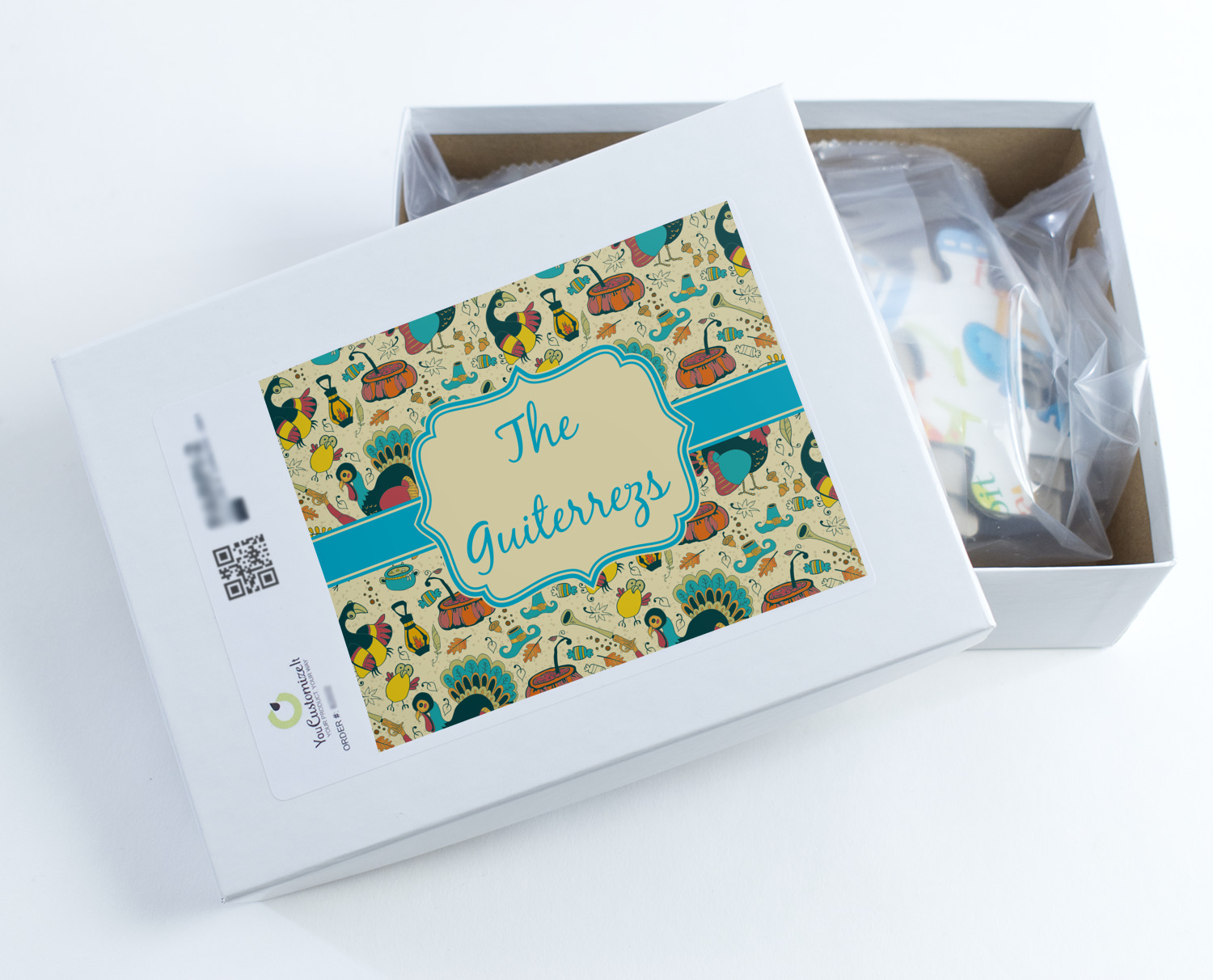 This Old Fashioned Thanksgiving design is hand drawn and includes pictures of turkey, birds, pot of food, lanterns, gun, candy, leaves and acorns; giving it a very old fashioned feel. The design has some of the traditional colors of oranges, reds and yellows, but also has a beautiful teal coloring in the turkey and the pilgrim hat; giving it a chic bold look.